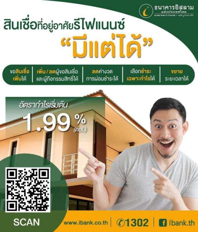 ธนาคารอิสลามแห่งประเทศไทย (ไอแบงก์) ออกผลิตภัณฑ์สินเชื่อที่อยู่อาศัยรีไฟแนนซ์ “มีแต่ได้” อัตรากำไรพิเศษเริ่มต้น 1.99% ต่อปี นาน 2 ปี โดยสามารถขอสินเชื่อเพิ่มได้ ลดค่างวดการผ่อนชำระได้ ขยายระยะเวลาได้ เลือกชำระเฉพาะกำไรได้ ให้วงเงินสูงสุด 20 ล้านบาท ผ่อนได้นานสูงสุด 40 ปี ฟรี! ค่าธรรมเนียม และค่าประเมินราคาหลักประกัน เตรียมเปิดตัวในงานมหกรรมการเงินกรุงเทพ พร้อมขนโปรโมชั่น เงินฝาก และตะกาฟุลร่วมงานอีกมาก มาย
