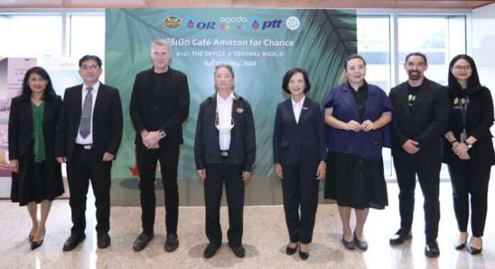 เมื่อเร็วๆ นี้ – นายไกรฤทธิ์ อุชุกานนท์ชัย ประธานกรรมการ บริษัท ปตท. จำกัด (มหาชน) (ที่ 4 จากซ้าย) พร้อมด้วย นางสาวดวงพร เที่ยงวัฒนธรรม รองกรรมการผู้จัดการใหญ่ กำกับดูแลองค์กรและกิจการสัมพันธ์ บริษัท ปตท. จำกัด (มหาชน) (ที่ 4 จากขวา) นายนิวัฒน์ จิตจำนงค์เมต ผู้จัดการฝ่ายบริหารธุรกิจร้านคาเฟ่ อเมซอน บริษัท ปตท. น้ำมันและการค้าปลีก จำกัด (มหาชน) (ที่ 2 จากซ้าย) และ นายจอห์น บราวน์ ประธานเจ้าหน้าที่บริหาร บริษัท อโกด้า จำกัด (Agoda) (ที่ 3 จากซ้าย) ร่วมพิธีเปิดร้านกาแฟ Café Amazon for chance สาขา The Offices @ Central World อย่างเป็นทางการ ซึ่งเกิดจากความร่วมมือของบริษัท อโกด้า จำกัด บริษัท ปตท. น้ำมันและการค้าปลีก จำกัด (มหาชน) และ บริษัท สานพลัง วิสาหกิจเพื่อสังคม จำกัด โดยสาขานี้นับเป็นสาขาที่ 10 แล้วที่ได้พัฒนาทักษะอาชีพ เสริมสร้างรายได้ และเปิดโอกาสให้แก่ผู้ด้อยโอกาสให้สามารถพึ่งพาตนเองได้ และเป็นการขยายผลลัพธ์ทางสังคมที่ยั่งยืนต่อไป