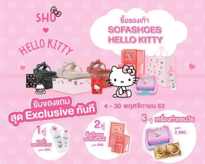 บอกเลยว่ากรี๊ดมากๆ สำหรับ HELLO KITTY (ฮัลโหล คิตตี้) ที่ได้รับเชิญให้มาเป็นส่วนหนึ่งของรองเท้า SHU กับคอลเลคชั่นใหม่ SHU x HELLO KITTY สุดน่ารัก ล่าสุด SHU จัดโปรโมชั่นเอาใจสาวๆต้อนรับเดือนต้นฤดูหนาว เมื่อซื้อรองเท้า SOFASHOES HELLO KITTY ใน ราคา 2,290 บาท ได้รับของแถมสุดพิเศษทันที ไม่ว่าจะเป็น ซื้อ1 คู่ แถมฟรี! ขวดน้ำ HELLO KITTY น่ารักฟรุ้งฟริ้ง จาก Lock & Lock แบรนด์หรู ลาย Hello Kitty ขนาด 650ml มูลค่า 300 บาท ซื้อ 2 คู่ แถมฟรี! ชั้นเก็บของอเนกประสงค์ มูลค่า 600 บาท และซื้อ 3 คู่ แถมฟรี! เครื่องทำแซนวิชสุดเก๋ ไม่เหมือนใคร พกพาสะดวก จะไปปิ๊กนิ๊ก หรือ แคมปิ้งอยู่ที่บ้าน ได้ตามใจชอบ มูลค่า 2,990 บาท ใครรู้ตัวว่าเป็นสาวกคิตตี้ รีบจับจองเป็นเจ้าของกันด่วน!! ตั้งแต่ วันที่ 4 ถึง 30 พฤศจิกายน 2563 จ้า