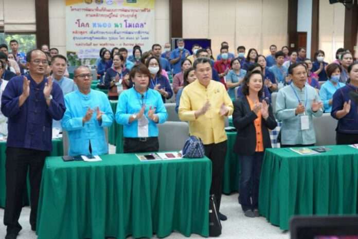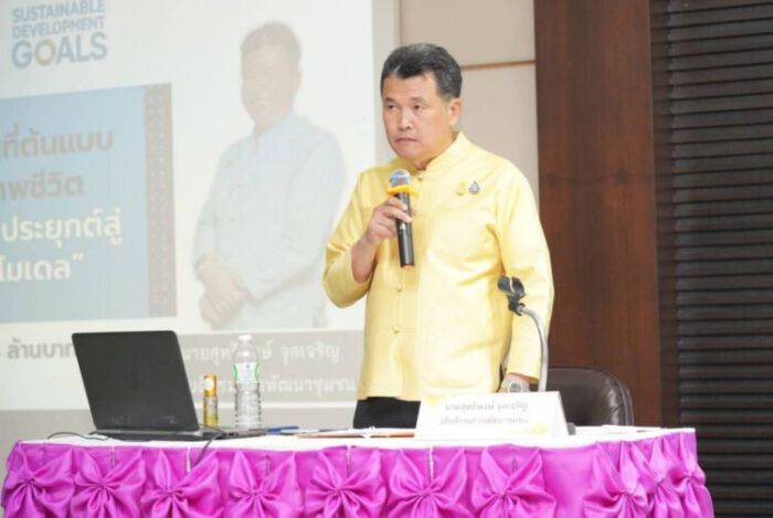 นายสุทธิพงษ์ จุลเจริญ อธิบดีกรมการพัฒนาชุมชน กล่าวเปิดการอบรมว่า งานของเราในครั้งนี้ถือว่ามีความสำคัญยิ่งในชีวิตการเป็นข้าราชการกรมการพัฒนาชุมชน นัยยะความสำคัญในที่นี้คือ ภารกิจการพัฒนาคุณภาพชีวิตพี่น้องประชาชนให้พึ่งพาตนเองได้ และสังคมไทยให้อยู่รอดปลอดภัยได้อย่างยั่งยืน ดังใน สคส. พระราชทาน ปี 2547 ของพระบาทสมเด็จพระบรมชนกาธิเบศร มหาภูมิพลอดุลยเดชมหาราช บรมนาถบพิตร ทรงเตือนเป็นรูปแผนที่ประเทศไทย พร้อมระเบิด 4 ลูก อันหมายถึงวิกฤตที่มนุษยชาติกำลังเผชิญอยู่ 4 ประการ คือ วิกฤตสิ่งแวดล้อม วิกฤตสังคม วิกฤตเศรษฐกิจ วิกฤตความขัดแย้งทางการเมืองการปกครอง ภัยเหล่านี้ต่างเกิดขึ้นพร้อมๆกันแล้วบนผืนแผ่นดินไทย ซึ่งในปัจจุบันก็ยังคงดำรงอยู่ สะท้อนให้เห็นว่า พระบาทสมเด็จพระบรมชนกาธิเบศร มหาภูมิพลอดุลยเดชมหาราช บรมนาถบพิตร ทรงเล็งเห็นและมีความห่วงใยถึงปัญหาเหล่านี้ ทางออกของประเทศไทยในการรอดพ้นวิกฤตและเกิดการพัฒนาที่ยั่งยืน คือการที่จะต้องพัฒนาประเทศตามหลักปรัชญาของเศรษฐกิจพอเพียง และทฤษฎีใหม่รูปแบบ โคก หนอง นา โมเดล ดังที่พระองค์ทรงลงมือทำด้วยพระองค์เองให้เห็นเป็นรูปธรรมผ่านโครงการในพระราชดำริกว่า 4,877 โครงการ