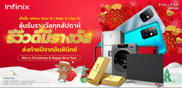 เมื่อวันที่ 6 ธันวาคม 2563 ที่ผ่าน ‘อินฟินิกซ์’ แบรนด์สมาร์ทโฟนสำหรับคนรุ่นใหม่เปิดขาย ‘Infinix ZERO 8i’ สมาร์ทโฟนรุ่นเรือธงของทางค่ายเป็นครั้งแรกในไทยซึ่งได้รับกระแสตอบรับเป็นอย่างดีตั้งแต่วันแรก ขายหมดสต๊อกภายใน 24 ชั่วโมง ซึ่งสำหรับลูกค้าที่สนใจสามารถติดตามโปรโมชั่นและพรีออเดอร์ ZERO 8i ได้ที่ Shopee เท่านั้น ยิ่งไปกว่านั้นทางอินฟินิกซ์ได้จัดกิจกรรมสุดพิเศษตอนรับปีใหม่ 2564 ตอบแทนลูกค้าอินฟินิกซ์กับกิจกรรม ‘รีวิวดีมีรางวัล’ พิเศษสำหรับผู้ที่ซื้อสมาร์ทโฟนกับ Infinix ในระหว่างวันที่ 6 ธันวาคม 2563 – 6 มกราคม 2564 ในรุ่น Infinix ZERO 8i, Note8 และ Hot10 รุ่นใดก็ได้ แล้วทำการรีวิวการใช้งานสมาร์โฟนในสไตล์ตัวเองทั้งในรูปแบบของรูปภาพ, วิดีโอหรือบทความก็ได้ทาง Social Media ของท่านพร้อมติด Hashtag #รีวิวดีมีรางวัล และ #InfinixFanFest มีสิทธิ์ลุ้นรับรางวัลพิเศษมากมายอาทิ ทองคำ, Smart TV, ตู้เย็น, เครื่องซักผ้าและโทรศัพท์มือถือ Infinix note8 อีกทั้งโชคชั้นที่2กับรางวัลพิเศษที่จะแจกทุกสัปดาห์ สัปดาห์ละ 5 รางวัลให้สำหรับผู้เข้าร่วมกิจกรรมรีวิว ของรางวัลมูลค่ารวมทั้งสิ้นกว่า 1 แสนบาท