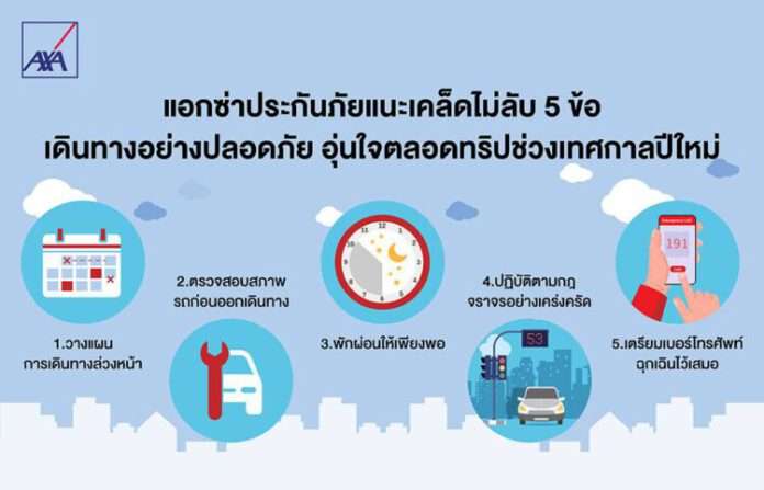 แอกซ่ามีความห่วงใยและพร้อมดูแลลูกค้าตลอดช่วงเทศกาลปีใหม่นี้ พร้อมนำเสนอแผนประกันภัยรถยนต์ที่เหมาะกับการขับขี่ทุกรูปแบบ เช่น ประกันภัยรถยนต์ชั้น 1, ประกันภัยรถยนต์ชั้น 2+ และประกันภัยรถยนต์ชั้น 3+ พร้อมมอบสิทธิประโยชน์มากมายให้แก่ลูกค้าผ่านบริการสุดพิเศษ “แอกซ่า โรดไซด์ เซอร์วิส” บริการช่วยเหลือฉุกเฉินทุกที่ตลอด 24 ชั่วโมง “แอกซ่าฟอร์ยู” ไม่หักค่าเสื่อมราคาที่เกิดจากอุบัติเหตุสำหรับยางรถยนต์ แบตเตอรี่ วิทยุและเครื่องเสียงที่ติดตั้งมาจากโรงงานประกอบรถยนต์ และ “แอกซ่า ชัวร์” บริการสำรวจอุบัติเหตุภายในเวลาที่กำหนดไม่เกิน 30 นาที ผู้สนใจสามารถซื้อกรมธรรม์ประกันภัยรถยนต์ของแอกซ่าได้ที่เว็บไซต์ www.axa.co.th/private-car-insurance