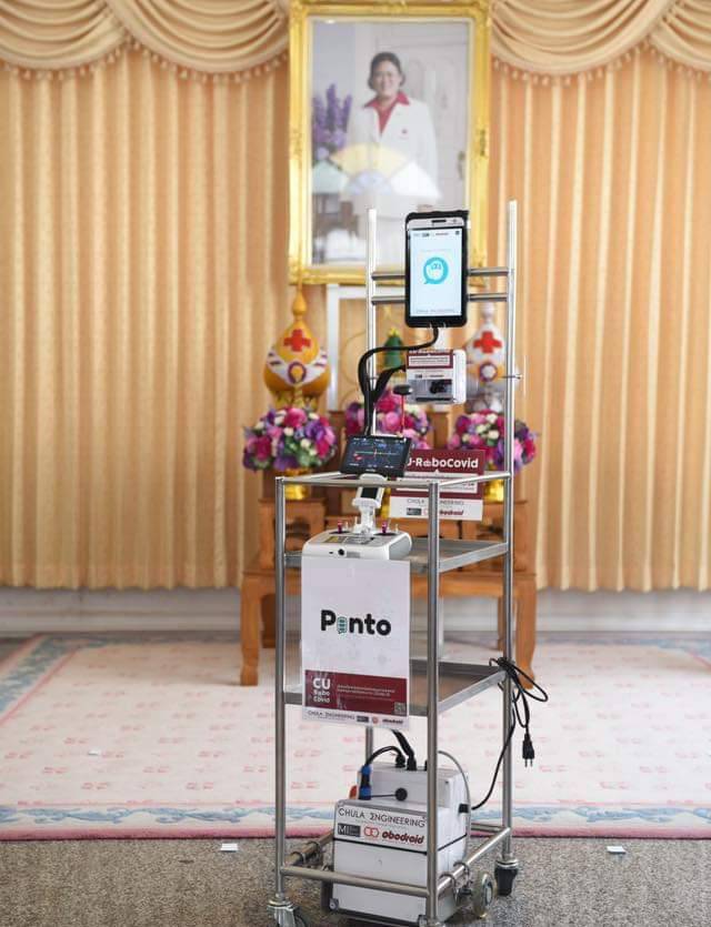 ทั้งนี้ หุ่นยนต์ปิ่นโต​ (Quarantine Delivery Robot) หรือหุ่นยนต์พัฒนาเพื่อการขนส่งและการสื่อสารทางไกลเพื่อช่วยบุคลากรทางการแพทย์ในช่วงสถานการณ์การระบาดของโควิด ได้รับการพัฒนาโดยทีม CU-RoboCovid ซึ่งเป็นความร่วมมือระหว่างคณะวิศวฯ จุฬาฯ Mi Workspace, HG Robotics และ Obodroid ได้รับการทดลองจริง​ เก็บข้อมูลจากผู้ใช้งานจริงกว่า​ 10 โรงพยาบาล​ เพื่อให้ตรงตามการใช้งานและความต้องการมากที่สุด ภารกิจหลักงานของหุ้นยนต์ปิ่นโตคือ 1. ขนส่งอาหาร​ ยา​ เวชภัณฑ์แก่คนไข้​ โดยการใช้ระบบขับเคลื่อนหุ่นยนต์บนรถเข็นควบคุมทางไกล​ ทำให้บุคลากรทางการแพทย์เสี่ยงน้อยลง​ ลดจำนวนครั้งที่ต้องเข้าไปอยู่ใกล้ชิดผู้ติดเชื้อ​ และยังสามารถคอยดูแลความเคลื่อนไหวของคนไข้ได้อย่างใกล้ชิด 2. ช่วยในการสื่อสารระยะไกล ด้วยหน้าจอที่ติดอยู่บริเวณ​ รถเข็นควบคุมทางไกล​ ทำให้แพทย์​และพยาบาล​ สามารถดูแลคนไข้ได้ตลอด​ โดยที่ระบบนี้จะช่วยลดทั้งอุปกรณ์การแพทย์ที่ต้องทิ้งทุกครั้งเมื่อเปลี่ยนโซนการตรวจและลดระยะเวลาการเข้าใกล้ชิดผู้ติดเชื้อ ลดความเสี่ยง​ เพิ่มประสิทธิภาพ​ และยังคงดูแลอย่างดี