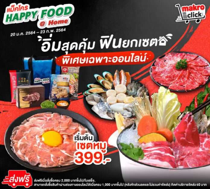 จุดขายหนึ่งของ แคมเปญ Happy Food @ Home คือการสร้างประสบการณ์ใหม่ๆ ให้กับลูกค้าอย่างต่อเนื่อง โดยเลือกหยิบจับเมนูยอดนิยมในกระแสมาจัดทำโปรโมชั่น อาทิ “ชุดชาบูอิ่มสุดคุ้ม ฟินยกเซ็ต อร่อยง่ายได้ที่บ้าน” ที่จะเปิดตัวในวันที่ 20 ม.ค.- 23 ก.พ.2564เฉพาะช่องทางการสั่งผ่านออนไลน์ www.makroclick.com เท่านั้น เน้นความหลากหลาย พร้อมอุปกรณ์ของแถม รองรับครอบครัวหลายขนาด ประกอบด้วย ชุดชาบูหมูสไลด์รวมชุดไห่ติเหลา ราคา 399 บาท, ชุดชาบูซีฟู้ดซุปหมาล่า ราคา 599 บาท, ชุดชาบูเนื้อซุปเข้มข้น ราคา 799 บาท, ชุดชาบูหมูพร้อมหม้อสุดคุ้ม ราคา 699 บาท, ชุดชาบูซีฟู้ดพร้อมหม้อสุดคุ้ม ราคา 899 บาท, ชุดชาบูเนื้อพร้อมหม้อสุดคุ้ม ราคา 1,099 บาท