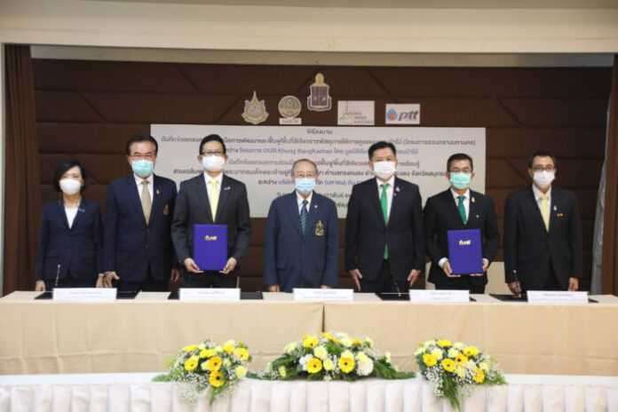 วันที่ 4 กุมภาพันธ์ 2564 – นายจตุพร บุรุษพัฒน์ ปลัดกระทรวงทรัพยากรธรรมชาติและสิ่งแวดล้อม ให้เกียรติเป็นประธานในพิธีลงนามบันทึกข้อตกลง (MOU) 2 ฉบับ ประกอบด้วย บันทึกข้อตกลงความร่วมมือการพัฒนาและฟื้นฟูพื้นที่สีเขียวราชพัสดุภายใต้การดูแลของกรมป่าไม้ (โครงการสวนกลางมหานคร) อำเภอพระประแดง จังหวัดสมุทรปราการ ระหว่าง โครงการ OUR Khung BangKachao โดยมูลนิธิชัยพัฒนา กับกรมป่าไม้ และบันทึกข้อตกลงความร่วมมือโครงการฟื้นฟูพื้นที่สีเขียวและบริหารจัดการเรียนรู้ สวนเฉลิมพระเกียรติพระบาทสมเด็จพระเจ้าอยู่หัว 80 พรรษา ต.ทรงคนอง อ.พระประแดง จ.สมุทรปราการระหว่าง กรมป่าไม้ กับ บริษัท ปตท. จำกัด (มหาชน) (ปตท.) ณ สำนักงานมูลนิธิชัยพัฒนา