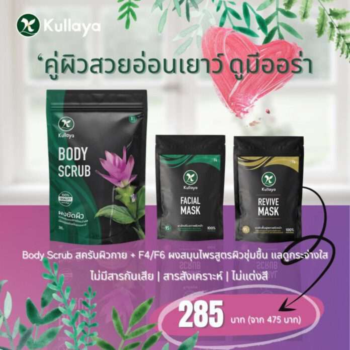 และในช่วงเดือนแห่งความรักนี้ โดยเฉพาะช่วงใกล้วันวาเลนไทน์ สมุนไพร Kullaya จึงอยากเอาใจสาวๆ เพื่อให้อวดผิวสวย กระจ่างใส ในชุดออกเดทได้อย่างมั่นใจ ด้วยโปรโมชั่นพิเศษสุดคุ้ม (ซื้อ 1 แถม 2) จับคู่สครับผิวสวย 3 สูตร สำหรับคืนผิวสวยให้กับสาวๆ ทั้งผิวหน้าและผิวกายภายใน 1 สัปดาห์ กับราคาเพียงเซ็ทละ 285 บาทเท่านั้น !! (ส่งฟรี)
