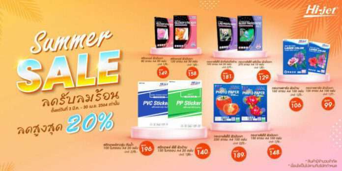 บริษัท ปภาวิน จำกัด ผู้จัดจำหน่ายกระดาษและหมึกพิมพ์ ภายใต้แบรนด์ Hi-jet (ไฮ-เจ็ท) “ที่ 1 เรื่องงานพิมพ์” เปิดเผยว่า บริษัทฯ ได้จัดโปรโมชั่นพิเศษเอาใจขาช้อป “SUMMER SALE ลดรับลมร้อน สูงสุด20%” ลดราคายาว 2 เดือนเต็ม ตั้งแต่วันที่ 3 มีนาคม – 31 เมษายน 2564 พร้อมบริการส่งถึงมือลูกค้าฟรีไม่มีค่าใช้จ่ายเพิ่มเติม