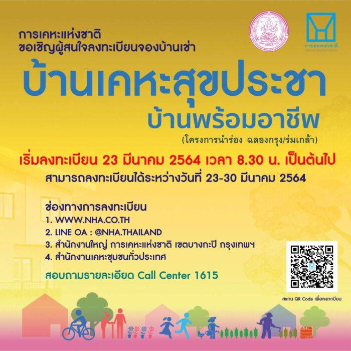 การเคหะแห่งชาติเปิดให้ผู้มีรายได้น้อยลงทะเบียนจองอาคารเช่าโครงการบ้านเคหะสุขประชาร่มเกล้าและโครงการบ้านเคหะสุขประชาฉลองกรุง โดยมีคุณสมบัติดังนี้ 1. เป็นประชาชนที่ถือสัญชาติไทย 2. เป็นผู้ได้รับผลกระทบจากสภาวะเศรษฐกิจถดถอยอันเนื่องมาจากสถาณการณ์การแพร่ระบาดของโรคติดเชื้อไวรัสโคโรนา 2019 (COVID – 19) อาทิ ถูกเลิกจ้างงาน เปลี่ยนอาชีพ ย้ายถิ่นฐาน รายได้ลดลง เป็นต้น 3. เป็นผู้ว่างงาน เป็นครอบครัวเลี้ยงเดี่ยว เป็นคนพิการ เป็นผู้สูงอายุ และเป็นผู้ได้รับผลกระทบจากการไล่รื้อเวนคืน ข้าราชการเกษียณ เป็นไปตามหลักเกณฑ์และกฎหมายกำหนด 4. บรรลุนิติภาวะ สามารถจัดทำนิติกรรมสัญญากับการเคหะแห่งชาติได้ เป็นไปตามที่กฎหมายกำหนด 5. เป็นผู้มีรายได้ไม่เกิน 30,000 บาท ต่อเดือนต่อครัวเรือน จากเอกสารรับรองตนเองและผ่านการพิสูจน์ตรวจสอบหลักฐานจากการเคหะแห่งชาติ