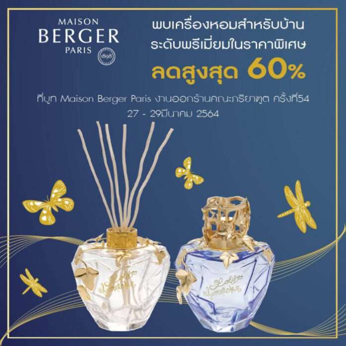 เมซอง แบร์เช่ ปารีส (Maison Berger Paris) ผู้นำเครื่องหอมบ้านระดับพรีเมี่ยมจากประเทศฝรั่งเศส สร้างอากาศบริสุทธิ์ให้ทุกมุมในบ้าน ขอเชิญเลือกซื้อเครื่องหอมสำหรับบ้านครบทุกรูปแบบความหอม มาพร้อมโปรโมชั่นสุดพิเศษ และพิเศษสุดกับตะเกียงน้ำหอม กลุ่ม Art Edition ลดสูงสุด 60% ภายในงานออกร้านคณะภริยาทูต ครั้งที่ 54 (the 54th Diplomatic Red Cross Bazaar) มหกรรมสินค้านานาชาติเพื่อการกุศลแห่งปี โดยความร่วมมือจากสภากาชาดไทยและคณะภริยาทูต พบกับเมซอง แบร์เช่ ปารีส ได้ที่ บูท R27 ระหว่างวันที่ 27 – 29 มีนาคม 2564 เวลา 10.00 – 20.00 น. ณ รอยัลพารากอนฮอล์ สยามพารากอน