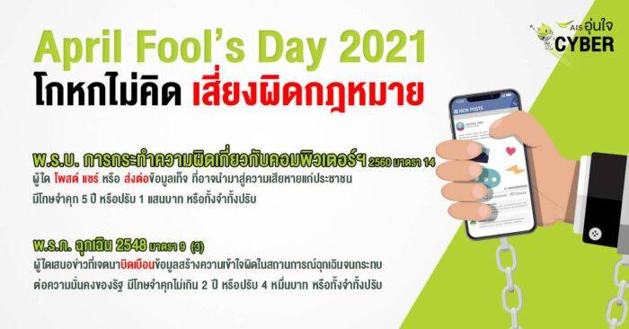 AIS อุ่นใจCyber ที่ให้ความสำคัญกับการส่งเสริมการใช้ออนไลน์อย่างถูกวิธี ในฐานะเพื่อนคู่คิดดิจิทัลของคนไทย จึงขอเป็นอีกหนึ่งพลังสำคัญร่วมเตือนคนไทยให้ใช้ออนไลน์อย่างมีสติ ไม่นำเข้าข้อมูลอันเป็นเท็จที่อาจจะก่อให้เกิดความเข้าใจผิด พร้อมกับเช็คข้อมูลให้ชัวร์ก่อนส่งต่อเสมอ โดยเฉพาะอย่างยิ่งในวันที่ 1 เมษายน เพราะไม่เช่นนั้นอาจเกิดความผิดฐานนำเข้าสู่ระบบคอมพิวเตอร์ซึ่งข้อมูลคอมพิวเตอร์อันเป็นเท็จ ตาม “พ.ร.บ.คอมพิวเตอร์ มาตรา 14 ปี 2560” ว่าด้วยการกระทำความผิดเกี่ยวกับคอมพิวเตอร์ฯ โดยการนําเข้าข้อมูลมีความบิดเบือน เป็นความจริงบางส่วน หรือไม่เป็นความจริงทั้งหมด โดยน่าจะเกิดความเสียหายแก่ประชาชน มีโทษจำคุก 5 ปี หรือปรับ 100,000 บาท หรือทั้งจำทั้งปรับ ผู้ส่งต่อมีอัตราโทษเท่ากัน  รวมถึง “พ.ร.ก. ฉุกเฉิน 2548 มาตรา 9 (3)” ที่ว่าห้ามเสนอข่าวที่มีข้อความอันอาจทำให้ประชาชนเกิดความหวาดกลัว หรือเจตนาบิดเบือนข้อมูลข่าวสาร ทำให้เกิดความเข้าใจผิด ในสถานการณ์ฉุกเฉิน จนกระทบต่อความมั่นคงของรัฐ หรือ ความสงบเรียบร้อย หรือศีลธรรมอันดีของประชาชน ทั้งในเขตพื้นที่ที่ประกาศสถานการณ์ฉุกเฉิน หรือทั่วราชอาณาจักรมีโทษจำคุกไม่เกิน 2 ปี หรือปรับไม่เกิน 40,000 บาท หรือทั้งจำทั้งปรับ