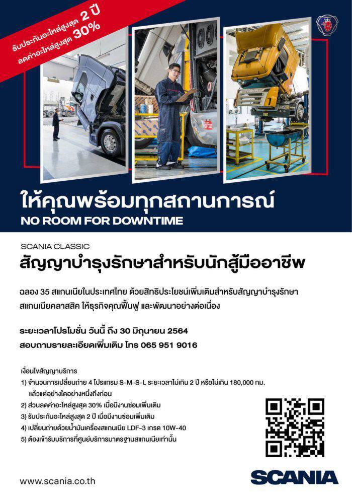 นายจักรี รักขาวชญานนท์ ผู้จัดการด้านสัญญาบริการ บริษัท สแกนเนียสยาม จำกัด กล่าวว่า ในปัจจุบัน “สัญญาบริการ”เป็นปัจจัยในการตัดสินใจของลูกค้าเพื่อเลือกซื้อรถ โดยเฉพาะในเชิงพาณิชย์อย่างรถบรรทุกและรถโดยสาร ที่ผู้ซื้อนำไปใช้ทำมาหากิน สัญญาบริการจึงเป็นการดูแลงานซ่อมและบำรุงรักษาให้กับลูกค้าด้วยมาตรฐานศูนย์บริการสแกนเนีย ลูกค้าจึงมั่นใจได้กับอะไหล่แท้พร้อมรับประกันและงานซ่อมตามมาตรฐานสแกนเนีย โดยสแกนเนียมีระบบสัญญาณเชื่อมโยงกับตัวรถ เพื่อนำข้อมูลมาทำการวิเคราะห์ปัญหาอย่างแม่นยำ สามารถเก็บประวัติการบำรุงรักษา ระยะทางการวิ่งของรถและพฤติกรรมการขับขี่ เพื่อนำมาปรับปรุงประสิทธิภาพได้อย่างดี โดยสแกนเนียจะมีสัญญาบริการให้เลือกพิจารณา 2 ประเภท คือ 1.สัญญาซ่อมและบำรุงรักษา และ 2.สัญญาบำรุงรักษา หรือ คือการดูแลงานเปลี่ยนถ่ายน้ำมันเครื่องและตรวจสอบสภาพรถ แต่ไม่รวมงานซ่อม สำหรับในช่วงสถานการณ์โควิด-19 สแกนเนียได้จัดโปรโมชั่นออกมาในแบบสัญญาบำรุงรักษาในราคาพิเศษ โดยจะมี 4 โปรแกรม คือ S-M-S-L S เป็นรอบเล็ก M รอบกลาง และ L รอบใหญ่ ในช่วงโปรโมชัน เหลือเพียง 66,000 บาท จากราคาปกติ 80,000-90,000 บาทต่อสัญญาบำรุงรักษา 4 โปรแกรม ทำให้จะช่วยลูกค้าประหยัดไปประมาณ 2 -3 หมื่นบาท นอกจากนี้รถทรัคของสแกนเนียที่ใช้แล้วเป็นเวลานาน ลูกค้าสามารถนำมาเปลี่ยนรถเป็นรถรุ่นใหม่ได้ โดยสแกนเนียมีแผนกรับซื้อรถใช้แล้วมาให้บริการด้วย