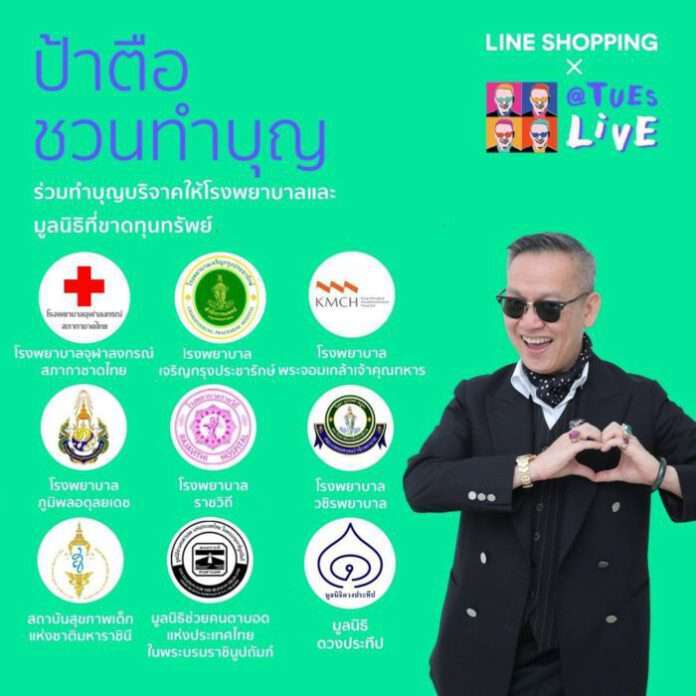 TuesLIVE ส่งแคมเปญ “ร่วมด้วย ช่วยโควิด-19” เพื่อส่งต่อน้ำใจให้กับโรงพยาบาลและมูลนิธิต่างๆ กว่า 14 แห่ง ผ่าน LINE SHOPPING โดยสามารถร่วมบริจาคในรูปแบบ Gift Card มูลค่าใบละ 100, 500, 1,000, 2,000 และ 3,000 บาท โดยไม่หักค่าใช้จ่ายนำไปมอบสมทบ พร้อมทั้งทางรายการร่วมสมทบทุนในแคมเปญร่วมบริจาค 1 ล้านบาท เพื่อเป็นโค้ดส่วนลด และยังได้รับ LINE POINTS ให้นำกลับไปใช้เป็นส่วนลดแทนเงินสด ในการจ่ายค่าน้ำค่าไฟหรือช้อปปิ้งผ่านทาง Rabbit LINE PAY โดยเปิดจำหน่ายตั้งแต่วันนี้เป็นต้นไป