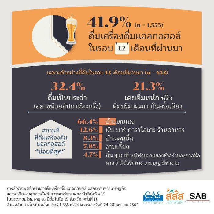 ศ.ดร.พญ.สาวิตรี อัษณางค์กรชัย ผู้อำนวยการศูนย์วิจัยปัญหาสุรา (ศวส.) คณะแพทยศาสตร์ มหาวิทยาลัยสงขลานครินทร์ สนับสนุนโดยสำนักงานกองทุนสนับสนุนการสร้างเสริมสุขภาพ (สสส.) กล่าวว่า ศวส. ร่วมกับ สสส. สำรวจพฤติกรรมการดื่มเครื่องดื่มแอลกอฮอล์ และผลกระทบทางเศรษฐกิจจากการแพร่ระบาดของโควิด-19 ในประชาชนอายุ 18 ปีขึ้นไป จำนวน 1,555 คน ใน 15 จังหวัดทั่วประเทศ ผ่านการสัมภาษณ์ทางโทรศัพท์ ระหว่างวันที่ 24-28 เมษายน 2564 พบว่า มีกลุ่มตัวอย่างที่เคยดื่มเครื่องดื่มแอลกอฮอล์ในช่วง 12 เดือนก่อนการสำรวจ ร้อยละ 41.9 ในกลุ่มนี้เป็นกลุ่มที่ดื่มประจำคือดื่มอย่างน้อยสัปดาห์ละหนึ่งครั้ง อยู่ที่ร้อยละ 32.4 และกลุ่มที่ดื่มหนักคือดื่มปริมาณมากในครั้งเดียว อยู่ที่ร้อยละ 21.3 อย่างไรก็ตาม เมื่อสอบถามถึงพฤติกรรมการดื่มในช่วง 30 วันก่อนการสำรวจ มีกลุ่มตัวอย่างที่ไม่ดื่มเครื่องดื่มแอลกอฮอล์ในช่วง 1 เดือนที่ผ่านมาเลยถึง ร้อยละ 28.4 และกลุ่มดื่มน้อยลง ร้อยละ 41.9 ขณะที่มีกลุ่มที่ดื่มเท่าเดิม ร้อยละ 28.1 และกลุ่มที่ดื่มเพิ่มขึ้นมีเพียงร้อยละ 1.6 เท่านั้น