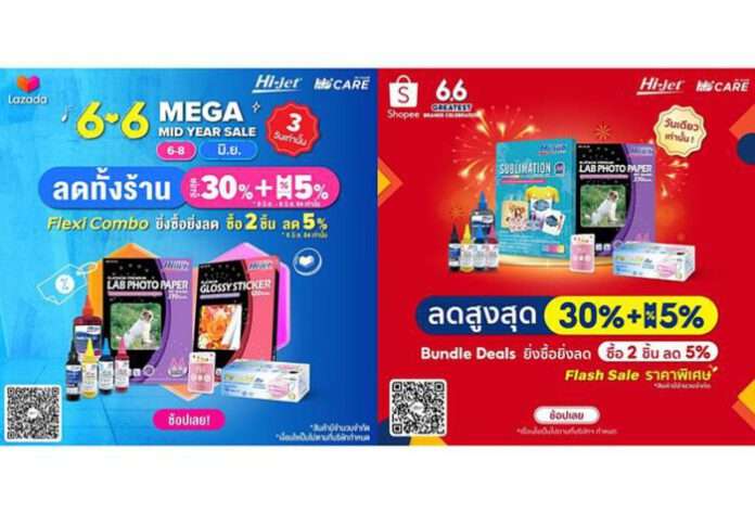 Hi-jet x Lazada 6.6 MEGA MID YEAR SALE: ลดราคาผลิตภัณฑ์ Hi-jet ทั้งกระดาษและหมึกพิมพ์ รวมถึงผลิตภัณฑ์แบรนด์ Hi-CARE ลดราคาทั้งร้านสูงสุดถึง 30 % ระหว่างวันที่ 6 – 8 มิถุนายน 64 เท่านั้นยังไม่พอ พร้อมพบกับช่วง Flexi Combo ยิ่งซื้อยิ่งลด เมื่อซื้อ 2 ชิ้นลด 5% แล้ว ยังมีคูปองส่วนลดเพิ่มสูงสุด 5% เมื่อซื้อสินค้าครบ 500 บาท อีกด้วย> (เฉพาะวันที่ 6 มิถุนายน 64) โดยลูกค้าสามารถเข้าไปเลือกซื้อสินค้าได้ที่: https://www.lazada.co.th/shop/papawin