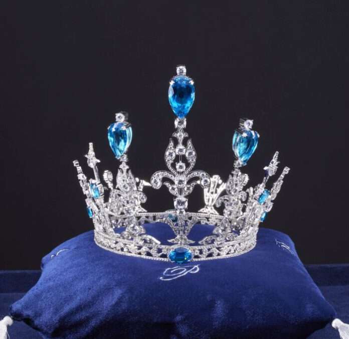 “มงกุฎ ซูพรีมาซี่ โทปาซ” ประดับด้วยอัญมณี “บลู โทปาส” 9 เม็ด ฝังเพชร 1,989 เม็ด ออกแบบและผลิตรวม 21 วัน ด้วยช่างฝีมือกว่า 45 คน มีมูลค่ากว่า 2.5 ล้านบาท