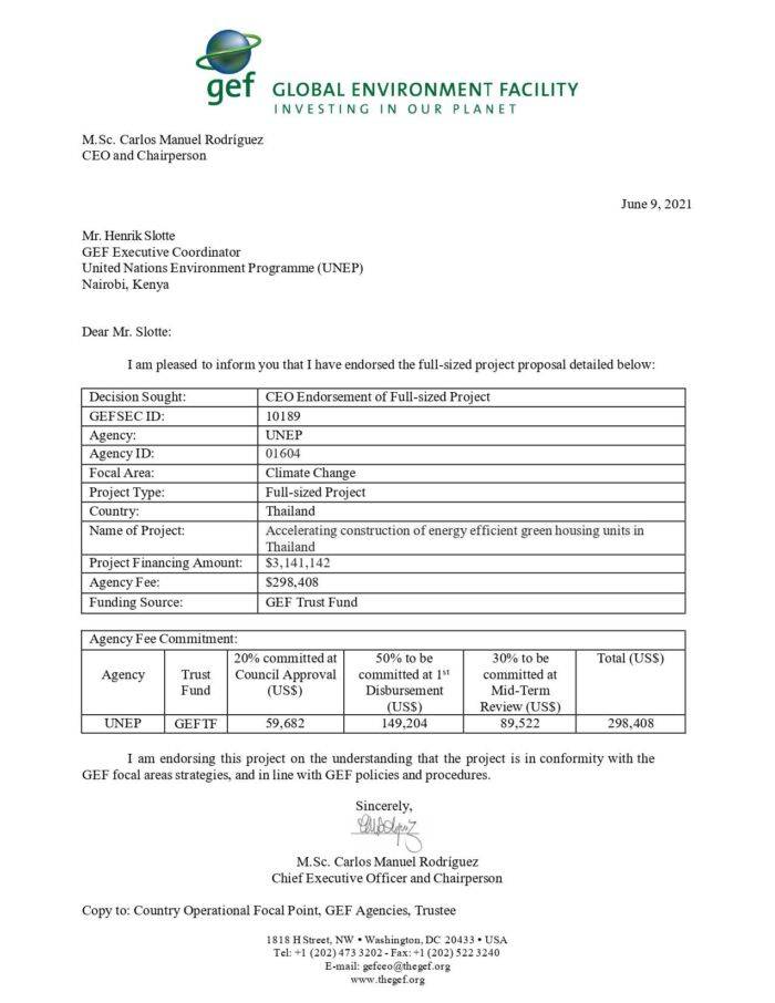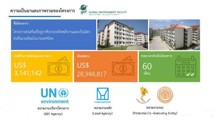ทั้งนี้ กคช. เป็นหน่วยงานหลักในการดำเนินโครงการดังกล่าว และมีโครงการสิ่งแวดล้อมแห่งสหประชาชาติ (United Nations Environment: UNEP) เป็นหน่วยงานบริหารโครงการ (GEF Agency) ในการประสานงานกับ GEF ขณะนี้ กคช.อยู่ระหว่างพิจารณารายละเอียดใน Project Cooperation Agreement เพื่อดำเนินการในส่วนที่เกี่ยวข้องต่อไป