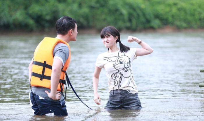 อีกฉากที่ต่อเนื่องกัน เป็นตอนที่ปุ้มสอนตรีกาลว่ายน้ำ เพราะตรีกาลว่ายน้ำไม่เป็น กลัวว่าผีน้ำจะมาทำร้ายได้อีก ปุ้มมัดเชือกให้ตรีกาลว่ายน้ำไปมา พร้อมเอาไม้ตี ถ้าหากขี้เกียจว่าย ตรีกาลว่ายไปมาจนเหนื่อย ก็เลยแกล้งผีเข้า ให้ปุ้มเอาหัวชนอีกรอบ พร้อมกระเซ้าเย้าแหย่กัน