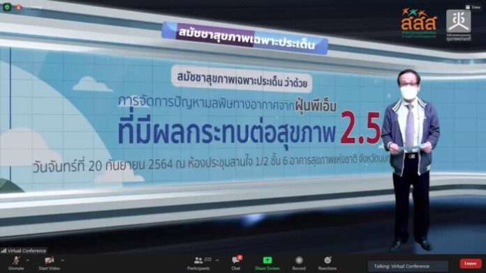 เมื่อวันที่ 20 กันยายน 2564 สำนักงานกองทุนสนับสนุนการสร้างเสริมสุขภาพ (สสส.) ร่วมกับ สำนักงานคณะกรรมการสุขภาพแห่งชาติ (สช.) และกรมควบคุมมลพิษ กระทรวงทรัพยากรธรรมชาติและสิ่งแวดล้อม (ทส.) จัดงาน “สมัชชาสุขภาพเฉพาะประเด็น ว่าด้วย การจัดการปัญหามลพิษทางอากาศจากฝุ่นพีเอ็ม 2.5 ที่มีผลกระทบต่อสุขภาพ” โดยมีผู้แทนจากภาคส่วนต่างๆ ทั้งภาคราชการ ภาคการเมือง ภาควิชาการ ภาควิชาชีพ ภาคการศึกษา ภาคประชาสังคม และภาคเอกชน เข้าร่วมงานกว่า 400 คน