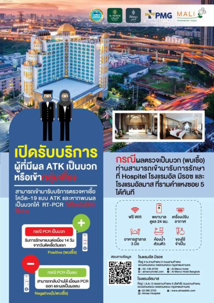โรงแรมอัล มีรอซ และโรงแรมอัลมาส เปิดรับบริการผู้ที่มีผล ATK เป็นบวก หรือเข้ากลุ่มเสี่ยง กรณีผลตรวจเป็นบวก (พบเชื้อ) หรือเข้ากลุ่มเสี่ยง ท่านสามารถเข้ามารับการรักษาที่ Hospitel โรงแรมอัล มีรอซ และโรงแรมอัลมาส ที่รามคำแหงซอย 5 ได้ทันที พร้อมทั้งเปิดรับบริการผู้ที่มีผล ATK เป็นบวก หรือเข้ากลุ่มเสี่ยง สามารถเข้ามารับบริการตรวจหาเชื้อโควิด-19 แบบ ATK และหากพบผลเป็นบวกให้ RT-PCR ได้โดยไม่มีค่าใช้จ่าย