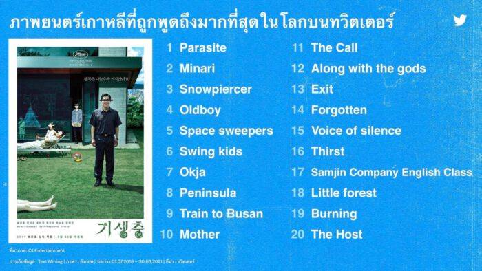 ทวิตเตอร์ได้เปิดเผย Top 20 ของ K-content ที่ถูกทวีตถึงมากที่สุด โดยรวบรวมข้อมูลและการวิเคราะห์ทวีตจากทั่วโลกที่เป็นภาษาอังกฤษ ตั้งแต่เดือนกรกฎาคม 2018 – มิถุนายน 2021 จากเก็บข้อมูล big data โดยใช้เทคนิค text mining ดำเนินการโดยทวิตเตอร์และ VAIVcompany มีดังนี้
