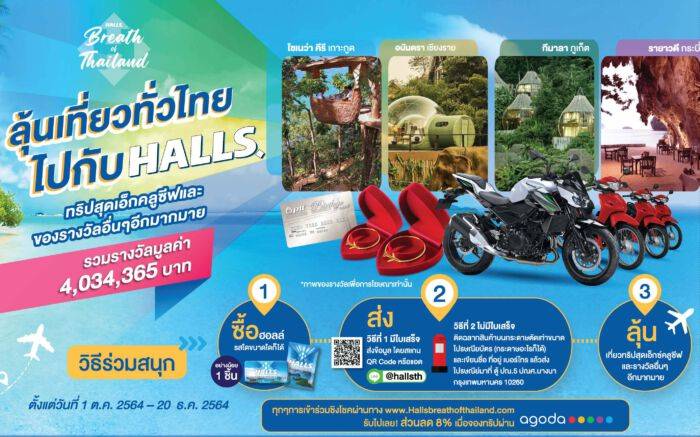 ด้าน อรวลัญช์ ลีเผ่าพันธุ์ ผู้จัดการผลิตภัณฑ์ฮอลล์ บริษัท มอนเดลีซ อินเตอร์เนชันแนล (ประเทศไทย) จำกัด กล่าวเพิ่มเติมถึงแนวคิด HALLS Breath of Thailand ชวนคนไทยออกเที่ยวทั่วไทยว่า “แคมเปญ HALLS Breath of Thailand ได้ออกผลิตภัณฑ์ฮอลล์ สเปเชียล เอดิชัน ผ่าน 4 รสชาติ กลิ่นราสพ์เบอร์รี, น้ำผึ้งผสมกลิ่นเลมอน, เมนโท-ลิปตัส และกลิ่นเฟรชไลม์ มาพร้อมดีไซน์แพคเกจจิ้งใหม่ล่าสุด สื่อถึงสถานที่ท่องเที่ยวในประเทศไทย พร้อมมอบประสบการณ์การท่องเที่ยวสุดเฟรชผ่านการสแกน QR Code บนแพคเกจจิ้งผลิตภัณฑ์ เพื่อเข้าไปพบกับสถานที่ท่องเที่ยว และร้านค้าทั่วไทยแบบ UNSEEN อีกหนึ่งกิจกรรมไฮไลท์ คือ ชวนลุ้นเที่ยวทั่วไทยไปกับฮอลล์ ฟรี! เพียงซื้อฮอลล์ ขนาดใดรสชาติใดก็ได้ ก็มีสิทธิ์ลุ้นรับรางวัลสุดเร้าใจ อาทิ แพ็คเกจท่องเที่ยวสุดเอ็กซ์คลูซีฟระดับ 6 ดาว ทั้งที่ ภูเก็ต กระบี่ เชียงราย และเกาะกูด พร้อมของรางวัลอื่นๆ อีกมากมาย อาทิ รถจักรยานยนต์ สร้อยคอทองคำ เป็นต้น รวมมูลค่าของรางวัลกว่า 4 ล้านบาท ตั้งแต่วันนี้ จนถึงวันที่ 20 ธ.ค. 2564”