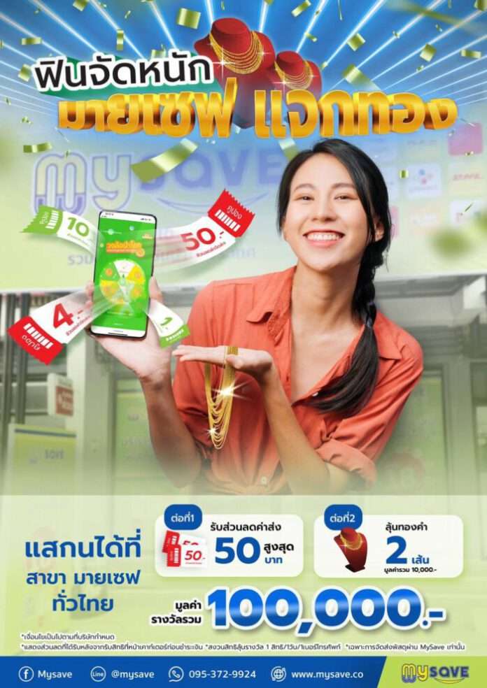 My Save แฟรนไชส์รวมขนส่ง จุดบริการชุมชนครบวงจร จัดโปรโมชั่นขอบคุณลูกค้า “ฟินจัดหนัก มายเซฟแจกทอง” รับคูปองส่วนลด มูลค่ารวม 50 บาท พร้อมทั้งได้รับสิทธิ์ลุ้นโชคทองคำ จำนวน 2 เส้น มูลค่ารวม 100,000 บาท ทุกวัน
