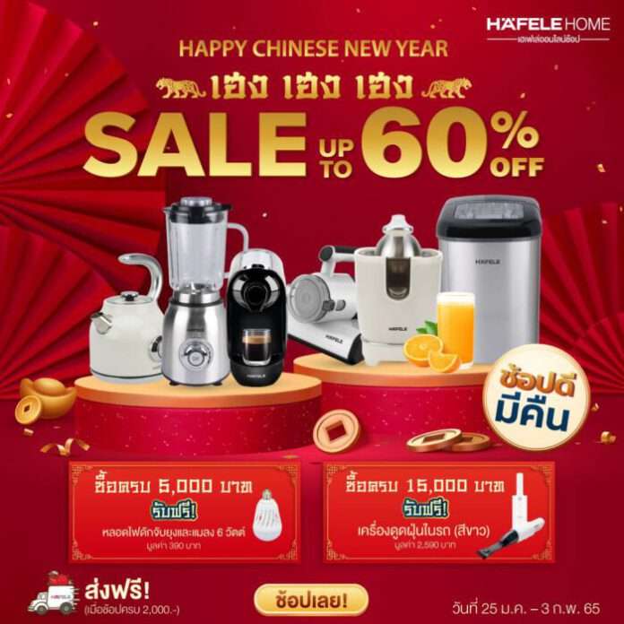 ซินเจียยู่อี่ ซินนี้ฮวดไช้~ ช้อปสินค้าเข้าบ้าน เฮง เฮง เฮง รับเทศกาลตรุษจีนบน HAFELEHOME ไปกับโปรโมชั่นสุดปังต้อนรับปีเสือ เฉลิมฉลองความสุขทั้งลด ทั้งแถม !! สินค้าเรื่องบ้านลดสูงสุดถึง 60% !! ไม่ว่าจะ #เครื่องคั้นน้ำส้มสไตล์เรโทร #เครื่องชงกาแฟ #เครื่องทำน้ำแข็ง #กาน้ำร้อนไฟฟ้า #เครื่องปั่นตั้งโต๊ะ พร้อมชุดอุปกรณ์ครัวลดราคาพิเศษอีกเพียบ และพลาดไม่ได้กับของแถมมากมายตลอดเทศกาล ช้อปครบ…รับฟรีได้ง่าย ๆ ช้อปครบ 5,000 บาท รับฟรี !! หลอดไฟดักจับยุงและแมลง 6 วัตต์ มูลค่า 390 บาท และช้อปครบ 15,000 บาท รับฟรี !! เครื่องดูดฝุ่นในรถ (สีขาว) มูลค่า 2,590 บาท พร้อมรับสิทธิพิเศษอีกสองต่อ กับสิทธิ์ลดหย่อนภาษี ในโครงการช้อปดีมีคืน พร้อมส่งสินค้าทุกชิ้นฟรีถึงหน้าบ้าน เมื่อช้อปครบ 2,000 บาทขึ้นไป…ได้ทุกคนไม่ต้องเสี่ยงโควิด อย่ารอช้า !! เฉพาะตรุษจีนนี้เท่านั้น เริ่มแล้ววันนี้ – 3 กุมภาพันธ์ 2565 คลิกช้อปเลยที่ www.hafelehome.co.th/collections/chinese-new-year