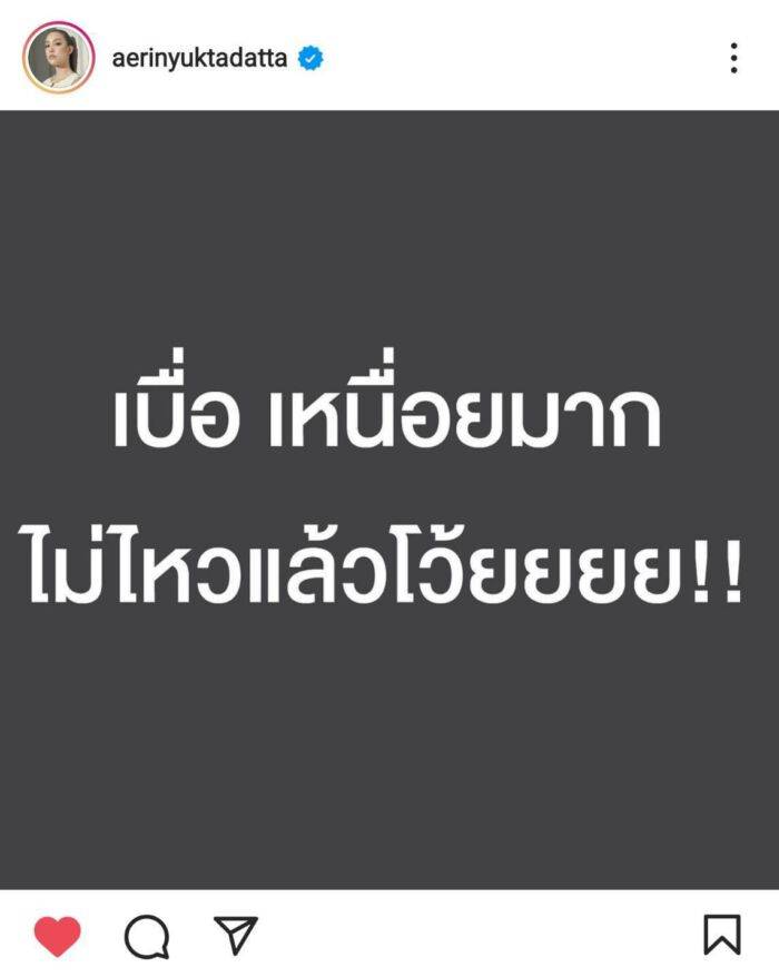 ไม่รู้ว่าเกิดอะไรขึ้นกับนางร้าย หุ่นแซ่บ อย่าง “แอริน ยุกตะทัต” ที่อยู่ดีๆก็ออกมาโพสต์ในไอจีส่วนตัว ว่า “เบื่อ เหนื่อยมาก ไม่ไหวแล้วโว้ยยยย!!” ทำเอาแฟนๆเข้ามาให้กำลังใจกันเพียบ พร้อมกับตั้งคำถามว่าอะไรที่ทำให้เธอเป็นแบบนี้ ซึ่งทางด้านของสาวแอริน ก็ยังไม่ได้ออกมาตอบแต่อย่างใด งานนี้คงทำได้เพียงส่งกำลังใจไปให้ เชื่อว่าถ้าเธอพร้อมเมื่อไหร่ คงจะออกมาบอกให้แฟนๆรู้อย่างแน่นอน