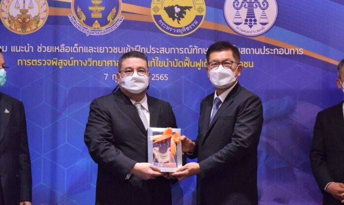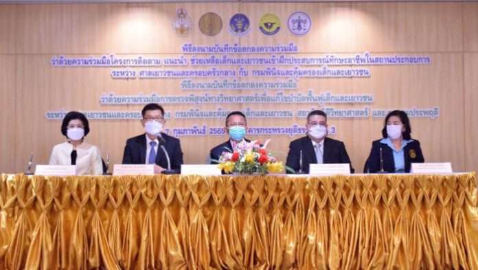 ทั้งนี้ นายประกอบ ลีนะเปสนันท์ อธิบดีผู้พิพากษาภาค ๗ ช่วยทำงานชั่วคราวในตำแหน่งอธิบดี ผู้พิพากษาศาลเยาวชนและครอบครัวกลาง ยังได้มีการลงนามลงนามบันทึกข้อตกลงความร่วมมือว่าด้วยการตรวจพิสูจน์ทางวิทยาศาสตร์เพื่อแก้ไขบำบัดฟื้นฟูเด็กและเยาวชน ระหว่างศาลเยาวชนและครอบครัวกลาง กรมพินิจและคุ้มครองเด็กและเยาวชน กรมคุมประพฤติ และสถาบันนิติวิทยาศาสตร์ โดยมีพันตำรวจโท วรรพงษ์ คชรักษ์ อธิบดีกรมพินิจและคุ้มครองเด็กและเยาวชน นายวิตถวัลย์ สุนทรขจิต อธิบดีกรมคุมประพฤติ และนายทรงศักดิ์ รักศักดิ์สกุล ผู้อำนวยการสถาบันนิติวิทยาศาสตร์ ร่วมลงนามความร่วมมือครั้งนี้ เพื่อนำวิธีการทางวิทยาศาสตร์มาปรับใช้กับงานแก้ไขบำบัดฟื้นฟูเด็กและเยาวชนในการติดตามแก้ไขและกำกับพฤติกรรม เพื่อให้เด็กและเยาวชนปฏิบัติตนอยู่ในกรอบ ไม่ยุ่งเกี่ยวกับยาเสพติดและปรับเปลี่ยนพฤตินิสัยให้สามารถอยู่ร่วมกับผู้อื่นในสังคมได้อย่างปกติสุขไม่หวนกลับไปกระทำความผิดซ้ำ