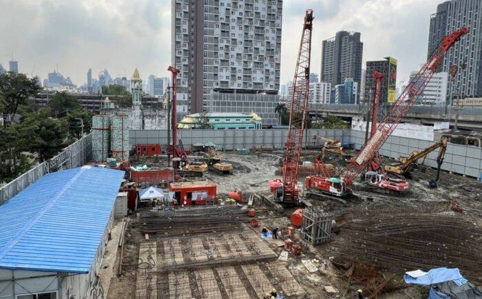 ความคืบหน้างานก่อสร้างปัจจุบันอยู่ระหว่างดำเนินการงานเสาเข็มเจาะทั้งหมด 254 ต้น ดำเนินการไปแล้ว 125 ต้น โดยเร่งรัดให้มีการดำเนินงานก่อสร้างและการเพิ่มเครื่องจักร อุปกรณ์ของงานเจาะเสาเข็ม และคาดว่าจะดำเนินการแล้วเสร็จภายในกุมภาพันธ์ 2565 เมื่อดำเนินการส่วนนี้เสร็จแล้ว จะเริ่มดำเนินการในส่วนของงาน Sheet Pile ซึ่งเป็นระบบโครงสร้างที่สามารถป้องกันดินระหว่างการก่อสร้าง ป้องกันดินพัง ป้องกันแรงดันน้ำ แรงดันดิน แรงดันอื่น ๆ ที่ทำให้เกิดการเคลื่อนตัวของสิ่งก่อสร้าง ที่อยู่ในส่วนของชั้นใต้ดินเช่น งานฐานราก งานถังน้ำชั้นใต้ดิน และงานโครงสร้างคอนกรีตเสริมเหล็ก (ค.ส.ล.) ที่อยู่ชั้นใต้ดิน ในส่วนของปัญหาฝุ่นละอองในอากาศจากการดำเนินการก่อสร้าง ได้ดำเนินการติดตั้งหัวฉีด สำหรับฉีดน้ำเป็นละออง ติดกับรั้วด้านชุมชน เพื่อลดปัญหาฝุ่นละออง