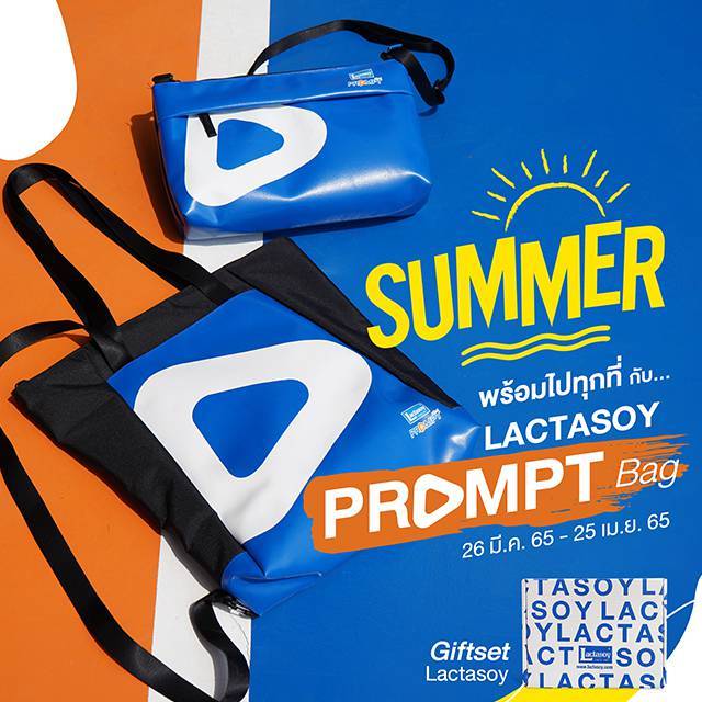 แลคตาซอย พร้อมพ์ ชวนสายเท่ห์มาอร่อยสุขภาพดีไปทุกที่รับซัมเมอร์กับ Gift Set Lactasoy Prompt อิ่ม อร่อย กับเเลคตาซอย 125 มล. 8 กล่อง และแลคตาซอย พร้อมพ์ 2 ขวด มาพร้อมกับ Lactasoy PROMPT Bag มีให้เลือก 2 เเบบ ได้แก่