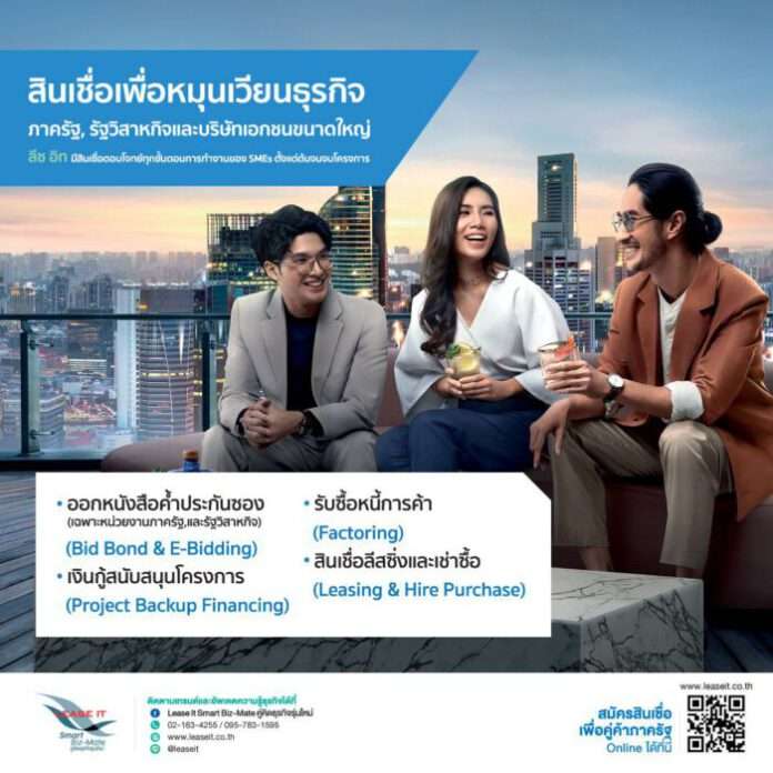 ด้วยผลิตภัณฑ์ทางการเงินที่หลากหลายตอบโจทย์ลูกค้าผู้ประกอบการรุ่นใหม่ในทุกสถานการณ์ธุรกิจ เพียงคุณเป็นคู่ค้ากับหน่วยงานราชการ รัฐวิสาหกิจ และบริษัทเอกชนขนาดใหญ่ก็สามารถใช้ ‘สินเชื่อเพื่อหมุนเวียนธุรกิจ’ กับลีซ อิท ได้หลากหลายประเภท ตั้งแต่สินเชื่อเพื่อออกหนังสือค้ำประกันซองประมูล (Bid Bond & EBidding) เมื่อคุณต้องการแข่งขันในการประมูลครั้งใหม่ สินเชื่อเพื่อสนับสนุนโครงการ (Project Backup Finance) เมื่อคุณต้องการเงินทุนเพื่อทำงาน ตลอดจน สินเชื่อยอดนิยม นั่นคือ บริการรับซื้อหนี้ทางการค้า (Factoring) กล่าวคือ เมื่อคุณทำงานเสร็จแล้วไม่อยากรอเครดิตเทอมนาน คุณสามารถใช้ใบวางบิลหรือใบตรวจรับงานมาเบิกเงินสดได้สูงสุด 90 %  ‘เบิกเงินสดได้ภายใน 24 ชั่วโมง’ เปิดโอกาสให้คุณให้ธุรกิจคุณเติบโตได้อย่างเต็มที่โดยไม่มีข้อจำกัดทางการเงิน  และยังมีแพคแกจสินเชื่ออื่นๆ อีกมากมายรองรับทุกประเภทธุรกิจ เช่น แพคเกจสินเชื่อเพื่อธุรกิจอุปกรณ์เครื่องมือทางการแพทย์ ธุรกิจขนส่งโลจิสติกส์ ธุรกิจเทรดดิ้ง ธุรกิจสื่อโฆษณา ธุรกิจไอที เป็นต้น