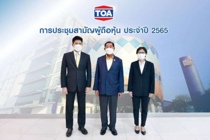 นายประจักษ์ ตั้งคารวคุณ ประธานกรรมการ และ นายจตุภัทร์ ตั้งคารวคุณ ประธานเจ้าหน้าที่บริหาร บริษัท ทีโอเอ เพ้นท์ (ประเทศไทย) จำกัด (มหาชน) หรือ TOA ผู้นำผลิตภัณฑ์สีทาอาคารและวัสดุก่อสร้างแบบครบวงจร พร้อมด้วยคณะกรรมการ ตลอดจนผู้บริหารระดับสูง ได้จัดการประชุมสามัญผู้ถือหุ้นประจำปี 2565 ผ่านสื่ออิเล็กทรอนิกส์ (E-AGM) เพื่อรายงานผลดำเนินงานประจำปี 2564 ทั้งนี้ที่ประชุมสามัญผู้ถือหุ้น อนุมัติเงินปันผลประจำปีจากกำไรสุทธิจากผลประกอบการงวดครึ่งปีหลังของปี 2564 ในอัตราหุ้นละ 0.19 บาท เป็นเงินปันผลที่จ่ายจำนวนทั้งสิ้น 385.51 ล้านบาท โดยมีกำหนดจ่ายเงินปันผลในวันที่ 23 พฤษภาคม 2565