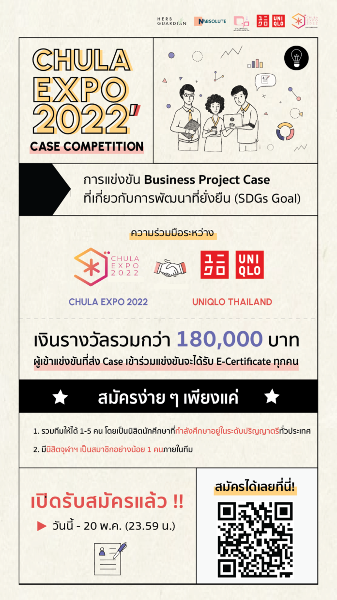ยูนิโคล่ ประเทศไทย ตอกย้ำพันธกิจด้านความยั่งยืนสู่สังคมไทย ร่วมมือกับงานจุฬาฯ วิชาการ หรือ CHULA EXPO 2022 จัดการแข่งขัน Business Project Case ที่เกี่ยวข้องการพัฒนาที่ยั่งยืน (SDGs Goal) ในชื่อ “CHULA EXPO 2022’ Case Competition” ให้กับนิสิตและนักศึกษาระดับปริญญาตรี  ทั่วประเทศ โดยรับสมัครตั้งแต่วันนี้ – 20 พฤษภาคม 2565 พร้อมชิงเงินรางวัลรวมกว่า 180,000 บาท