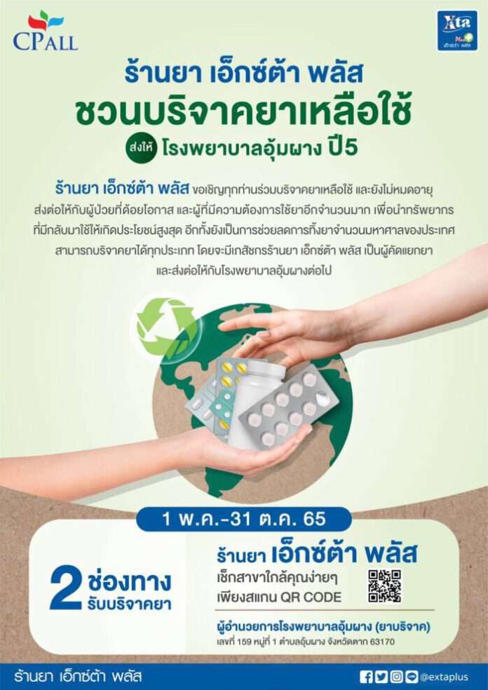 ร้านยา เอ็กซ์ต้า พลัส ในกลุ่มธุรกิจ ซีพี ออลล์ ร่วมกับโรงพยาบาลอุ้มผาง เชิญชวนร่วมบริจาคยาเหลือใช้ที่ยังไม่หมดอายุ เพื่อส่งต่อให้กับโรงพยาบาลอุ้มผาง นำไปแจกจ่ายให้กับผู้ป่วยที่อยู่ในกลุ่มผู้ไม่มีสิทธิในหลักประกันสุขภาพ โดยเปิดรับบริจาคตั้งแต่วันนี้ จนถึงวันที่ 31 ตุลาคม 2565