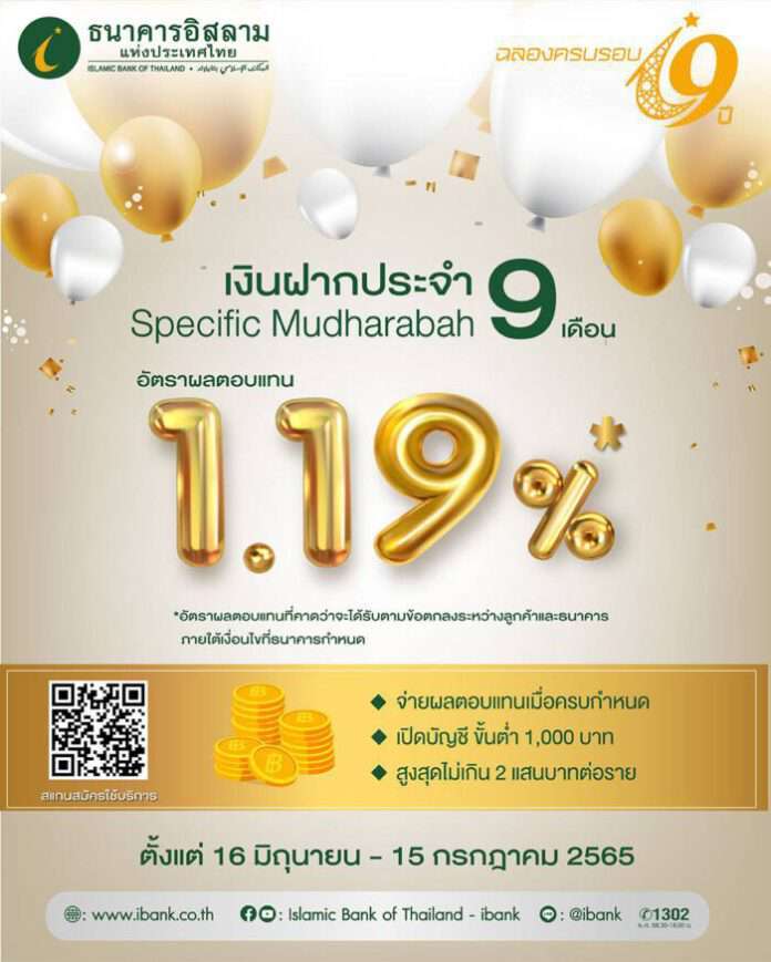 ธนาคารอิสลามแห่งประเทศไทย (ไอแบงก์) ออก “เงินฝากประจำ Specific Mudharabah” เงินฝากรูปแบบใหม่ที่ให้ผลตอบแทนที่คาดว่าจะได้รับ 1.19% ต่อปี เพื่อเฉลิมฉลองครบรอบวันสถาปนา 19 ปี ในวันที่ 12 มิถุนายนที่ผ่านมา