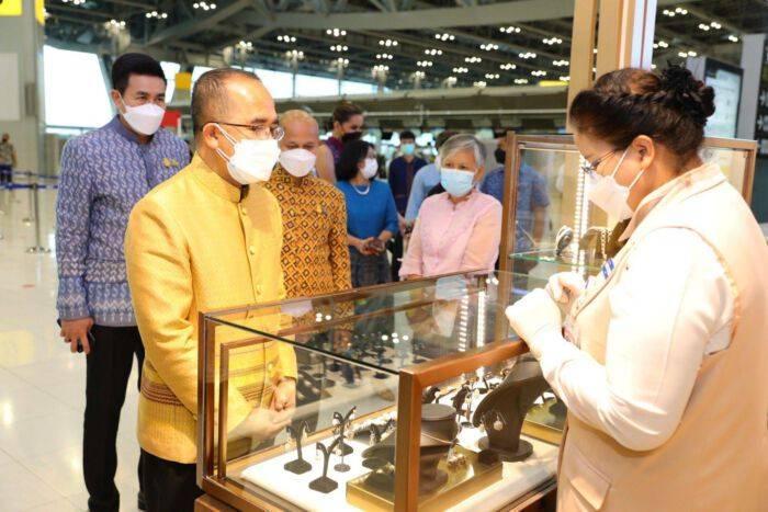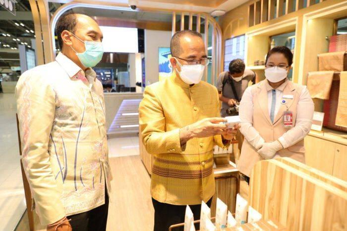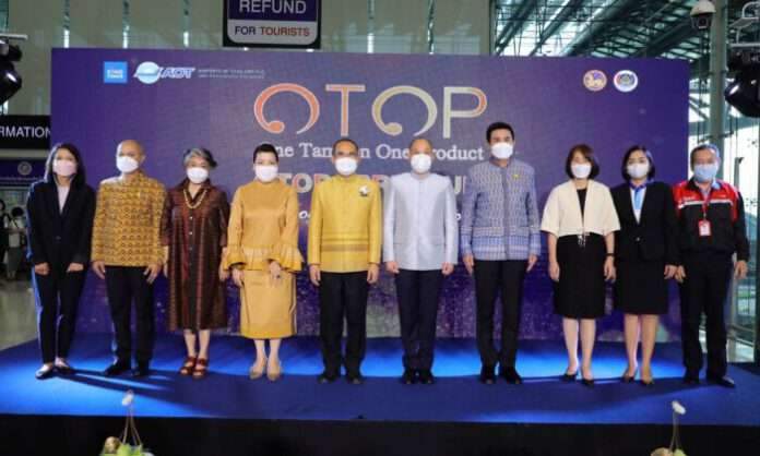 ทั้งนี้กรมการพัฒนาชุมชนได้ร่วมมือกับ คิง เพาเวอร์ (KING POWER) และท่าอากาศยานไทย (AOT) ผนึกกำลังครั้งใหญ่ รวมพลสุดยอดผลิตภัณฑ์ OTOP ยกระดับเพิ่มช่องทางการขายผ่านร้านค้า เดินหน้าหลังเปิดประเทศนำภูมิปัญญาท้องถิ่นบินทะยานสู่สากล (Time to Fly) โดยการเปิดร้านจำหน่ายผลิตภัณฑ์ OTOP สุวรรณภูมิ ภายใต้ชื่อร้าน OTOP Premium (Thai Local Wisdom Product) จำนวน 2 จุด โดยจุดที่ 1 ตั้งอยู่ ณ ประตูทางเข้า 3 อาคารผู้โดยสารขาออกระหว่างประเทศ และจุดที่ 2 ประตูทางเข้า 9 จุดเช็คอิน อาคารผู้โดยสารขาออกระหว่างประเทศ โดยมีวัตถุประสงค์ในการเผยแพร่ ประชาสัมพันธ์ สร้างการรับรู้ พร้อมทั้งจัดแสดงและจัดจำหน่ายผลิตภัณฑ์ OTOP ที่ผ่านการพัฒนาตามโครงการพัฒนาผลิตภัณฑ์ OTOP เพื่อจำหน่ายบนเครื่องบิน (OTOP ON BOARD) ผลิตภัณฑ์ที่ผ่านการคัดสรรสุดยอดหนึ่งตำบล หนึ่งผลิตภัณฑ์ไทยระดับ 3-5 ดาว และผ้าจากการประกวดผ้าลายพระราชทาน “ผ้าลายขอเจ้าฟ้าสิริวัณณวรีฯ” รวมจำนวน 234 ผลิตภัณฑ์ มีผู้ผลิต ผู้ประกอบการ OTOP เข้าร่วมจำหน่าย จำนวน 26 กลุ่ม/ราย