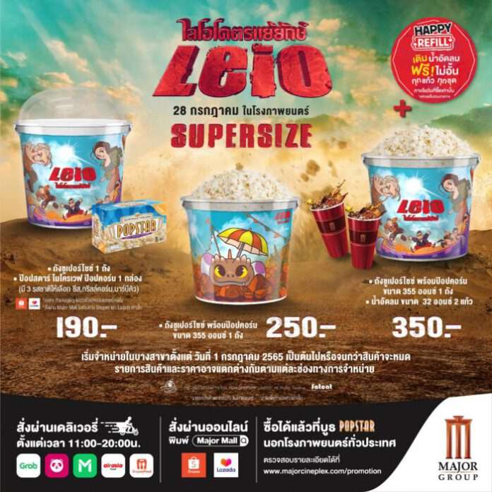 ต้อนรับภาพยนตร์จักรวาลสัตว์ประหลาดฟอร์มยักษ์ “Leio ไลโอโคตรแย้ยักษ์” ด้วยชุด Leio Supersize Set 3 แบบ ภายในเซ็ตประกอบด้วย แบบที่ 1 ถังซูเปอร์ไซซ์ Leio พร้อมป๊อปสตาร์ ไมโครเวฟ ป๊อปคอร์น (สามารถเลือกรสชาติได้ : รสชีส , บาร์บีคิว , กริลล์คอร์น) ราคา 190 บาท แบบที่ 2 ถังซูเปอร์ไซซ์ Leio พร้อมป๊อปคอร์นขนาด 355 ออนซ์ 1 ถัง ราคา 250 บาท และ แบบที่ 3 ถังซูเปอร์ไซซ์ Leio พร้อมป๊อปคอร์นขนาด 355 ออนซ์ 1 ถัง และน้ำอัดลมขนาด 32 ออนซ์ 2 แก้ว ในราคาพิเศษ 350 บาท พิเศษ!!! สามารถรับสิทธิ์เติมน้ำอัดลมฟรี ไม่อั้น (ภายในวันที่ซื้อเท่านั้น)