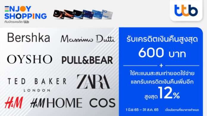 บัตรเครดิต ทีทีบี ชวนแฟชั่นเลิฟเวอร์อัปเทรนด์ให้สุดปัง พร้อมรับสิทธิพิเศษสุดคุ้มสบายกระเป๋า เมื่อช้อปผลิตภัณฑ์แบรนด์ BERSHKA, MASSIMO DUTTI, OYSHO, PULL&BEAR, TED BAKER, ZARA, H&M, H&M Home และ COS รวมรายการช้อปแบบออนไลน์ ตั้งแต่วันที่ 1 มิถุนายน – 31 สิงหาคม 2565 เมื่อชำระค่าสินค้าเต็มจำนวนด้วยบัตรเครดิต ทีทีบี รับสิทธิพิเศษ ดังนี้