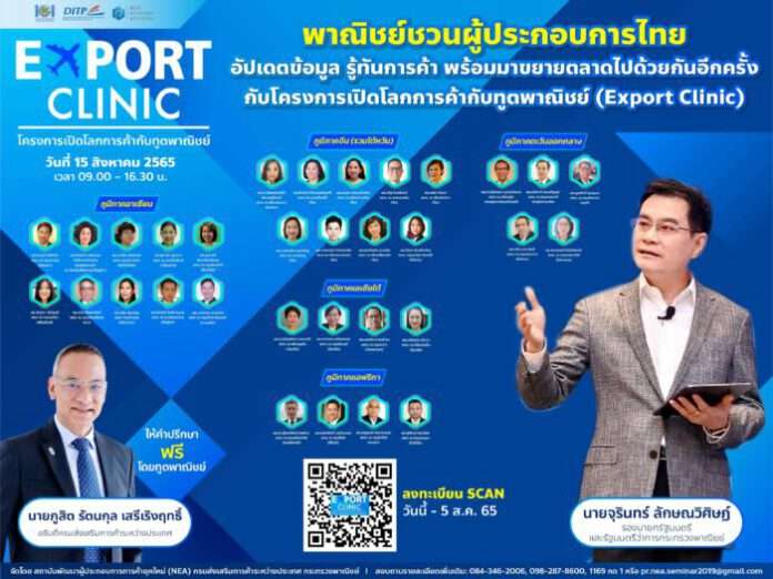 กระทรวงพาณิชย์ โดยสถาบันพัฒนาผู้ประกอบการการค้ายุคใหม่ (NEA) ชวนผู้ประกอบการไทยสมัครเข้าร่วม “โครงการเปิดโลกการค้ากับทูตพาณิชย์ (Export Clinic)” เพื่อรับคำปรึกษาด้านการค้าและการส่งออก ฟรี! โดยทูตพาณิชย์จาก 5 ภูมิภาค กว่า 32 สำนักงาน และในครั้งนี้มีภูมิภาคที่ได้รับความสนใจหลายแห่ง อาทิเช่น ภูมิภาคตะวันออกกลาง ภูมิภาคเอเชียใต้ ภูมิภาคอาเซียน ภูมิภาคจีน รวมไต้หวัน และภูมิภาคแอฟริกา