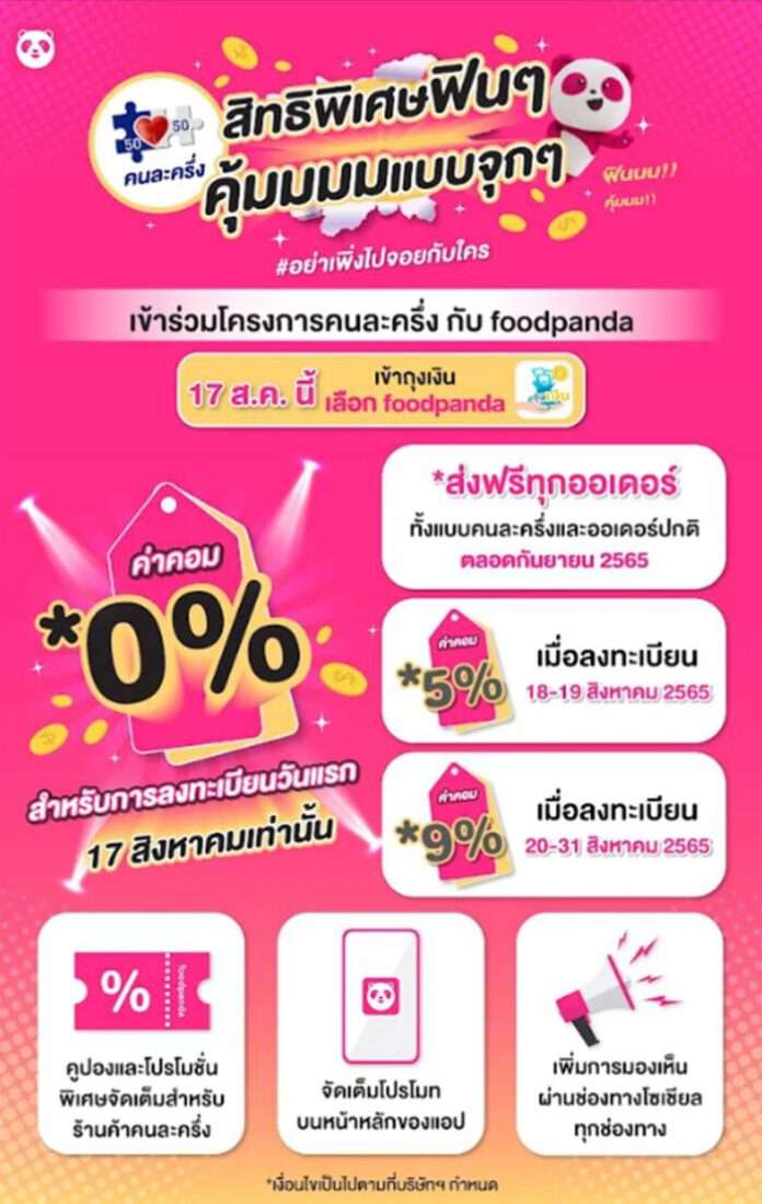 ส่งฟรีทุกออเดอร์* ทั้งแบบคนละครึ่งและออเดอร์ปกติสำหรับร้านค้าที่เข้าร่วมโครงการกับ foodpanda ตลอดกันยายน 2565 และสิทธิประโยชน์อื่น ๆ