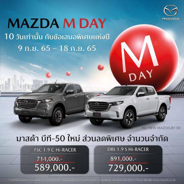 พร้อมกันนี้ ในเดือนกันยายน มาสด้ายังเตรียมส่งแคมเปญข้อเสนอสุดพิเศษแห่งปี ต้อนรับลูกค้าที่ต้องการเข้ามาเป็นส่วนหนึ่งกับครอบครัวมาสด้า ด้วยแคมเปญ MAZDA M DAY มอบฟรีแพ็กเกจบำรุงรักษา MAZDA CARE 5 ปี* ฟรีบัตรเติมน้ำมันสูงสุด 10,000 บาท* ฟรีประกันภัยชั้นหนึ่ง Mazda Premium Insurance 1 ปี* และลูกค้า 500 ท่าน แรก ที่จองรถมาสด้าทุกรุ่นภายในงาน รับฟรี Mazda Luggage มูลค่า 3,500 บาท1 และราคาพิเศษ มาสด้า บีที-50 ใหม่ ในรุ่น FSC 1.9 C Hi-RACER ราคาเพียง 589,000 บาท และ DBL 1.9 S Hi-RACER ราคาเพียง 729,000 บาท (จำนวนจำกัด) ระหว่างวันที่ 9-18 ก.ย. 65 นอกจากนั้น มาสด้ายังมอบข้อเสนอชุดแต่งแห่งปี 65 กับส่วนลดพิเศษ 10% ชุดแต่งรอบคัน2 และผ่อนชำระ 0% นานสูงสุด 10 เดือน3 ระหว่างวันที่ 1-30 ก.ย. 65 ที่โชว์รูมมาสด้าทั่วประเทศ