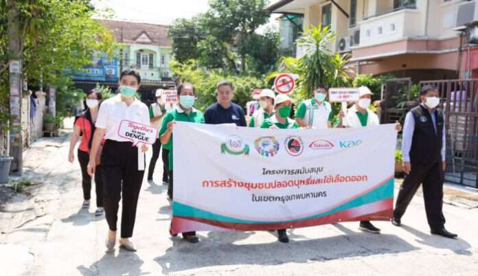 บริษัท ทาเคดา (ประเทศไทย) จำกัด บริษัทชีวเภสัชภัณฑ์ระดับโลก และหนึ่งในพันธมิตรภายใต้ความร่วมมือเกี่ยวกับโรคไข้เลือดออก Dengue-Zero นำโดย คุณประภาพรรณ พรหมมาตร ผู้อำนวยการ ฝ่ายรัฐกิจสัมพันธ์ ร่วมกับบริษัท คาโอ อินดัสเตรียล (ประเทศไทย) จำกัด เดินหน้าโครงการสนับสนุน ‘การสร้างชุมชนปลอดบุหรี่และไข้เลือดออก’ เผยแพร่ความรู้และการปฏิบัติจริงในการป้องกันและควบคุมโรคไข้เลือดออกให้แก่อาสาสมัครสาธารณสุข กรุงเทพมหานคร (อสส.) ในเขตคลองสามวา เพื่อนำไปต่อยอดและถ่ายทอดสู่ชุมชนให้ปลอดภัยจากไข้เลือดออก รวมถึงการแนะนำแอปพลิเคชัน “รู้ทัน” ซึ่งวิจัยและพัฒนาโดยศูนย์เทคโนโลยีอิเล็กทรอนิกส์และคอมพิวเตอร์แห่งชาติ (เนคเทค-สวทช) และกรมควบคุมโรค สนับสนุนการใช้งานโดย บริษัท คาโอ คอร์ปอเรชั่น ประเทศญี่ปุ่น เพื่อรับแจ้งเตือนสถานการณ์ความเสี่ยงของการแพร่ระบาดของไข้เลือดออกในตำแหน่งปัจจุบันและพื้นที่ที่สนใจ รวมทั้งวิธีป้องกันและควบคุมไข้เลือดออกอย่างการกำจัดแหล่งลูกน้ำยุงลายด้วยทรายอะเบท และ การปรับปรุงสิ่งแวดล้อมในบ้านและรอบบ้านให้เป็นระเบียบ เป็นต้น โดยตั้งเป้าสนับสนุนการดำเนินการอย่างต่อเนื่อง เฉพาะอย่างยิ่งในชุมชนที่มีการระบาดของไข้เลือดออกสูง ควบคู่ไปกับการรณรงค์เพื่อสร้างความตระหนักรู้ในเรื่องของโรคให้แก่คนในชุมชน ซึ่งในกิจกรรมลงพื้นที่ครั้งนี้ ได้รับเกียรติจากคุณพันธ์ศักดิ์ เจริญสุข ผู้อำนวยการเขตคลองสามวา เป็นประธานและลงพื้นที่ตรวจเยี่ยมชุมชน