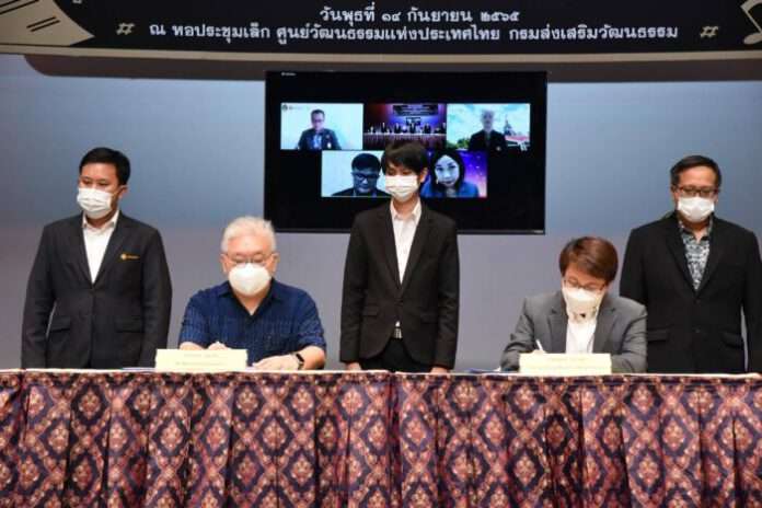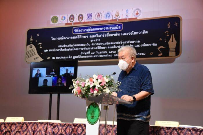 วันที่ 14 กันยายน 2565 เวลา 14.00 น. กรมส่งเสริมวัฒนธรรม (สวธ.) กระทรวงวัฒนธรรม ร่วมมือกับ สมาคมดนตรีและมาร์ชชิ่งอาร์ทสากล และสมาชิกภาคีเครือข่ายโครงการพัฒนาดนตรีศึกษา ดนตรีมาร์ชชิ่งอาร์ท และวงโยธวาทิต อีก 8 มหาวิทยาลัย ได้แก่ คณะมนุษยศาสตร์ มหาวิทยาลัยนเรศวร คณะศิลปกรรมศาสตร์ มหาวิทยาลัยทักษิณ คณะศิลปกรรมศาสตร์ มหาวิทยาลัยราชภัฏสงขลา คณะกรรมการส่งเสริมกิจการมหาวิทยาลัยขอนแก่น คณะมนุษยศาสตร์ มหาวิทยาลัยราชภัฏเชียงราย คณะศึกษาศาสตร์และศิลปะศาสตร์ มหาวิทยาลัยหาดใหญ่ บันทึกลงนามในข้อตกลงความร่วมมือ (MOU) ในการพัฒนาดนตรีศึกษา ดนตรีมาร์ชชิ่งอาร์ท และวงโยธวาทิต โดยมีนายชาย นครชัย อธิบดีกรมส่งเสริมวัฒนธรรม ให้เกียรติเป็นประธาน พร้อมด้วย นายสมเมธ ยุวะสุต นายกสมาคมดนตรีและมาร์ชชิ่งอาร์ทสากล คณบดีจากมหาวิทยาลัยนเรศวร มหาวิทยาลัยราชภัฏเชียงราย มหาวิทยาลัยพายัพ มหาวิทยาลัยทักษิณ มหาวิทยาลัยหาดใหญ่ มหาวิทยาลัยพะเยา มหาวิทยาลัยเกษตรศาสตร์ มหาวิทยาลัยราชภัฏสงขลา มหาวิทยาลัยมหาสารคาม มหาวิทยาลัยเชียงใหม่ มหาวิทยาลัยขอนแก่น คณะผู้บริหารของ สวธ. และแขกผู้มีเกียรติ ร่วมในพิธีฯ ณ หอประชุมเล็ก ศูนย์วัฒนธรรมแห่งประเทศไทย และผ่านระบบ Zoom