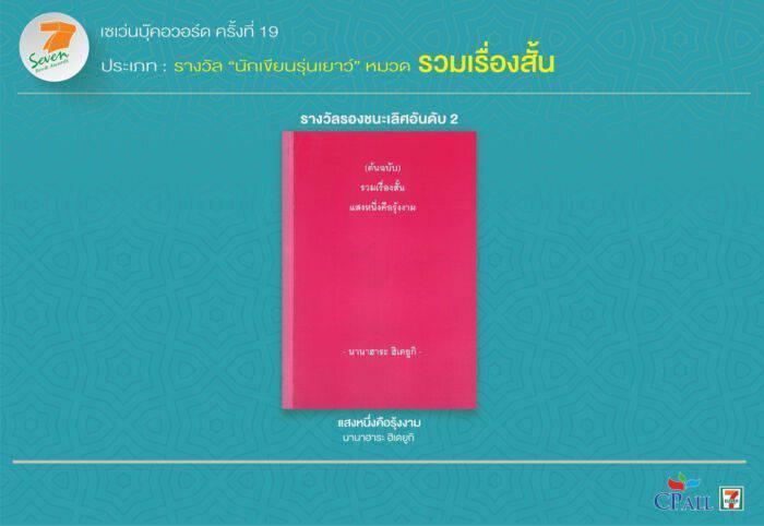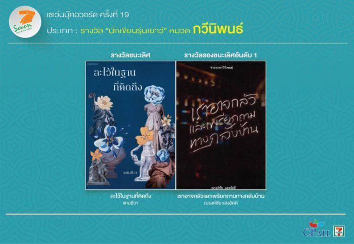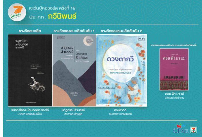 ทั้งนี้ ผลการตัดสินการประกวดหนังสือดีเด่นรางวัลเซเว่นบุ๊คอวอร์ด ครั้งที่ 19 ประจำปี 2565 มีดังนี้ ประเภทกวีนิพนธ์ ชนะเลิศ “จนกว่าโลกจะโอบกอดเราเอาไว้” ของ “ปาลิตา ผลประดับเพ็ชร์” รองชนะเลิศอันดับ 1 “นาฏกรรมจำนรรจ์” ของ “ศิวกานท์ ปทุมสูติ” รองชนะเลิศอันดับ 2 “ดวงตากวี” ของ “รินศรัทธา กาญจนวตี” และรางวัลยกย่องการสืบสานวรรณศิลป์ท้องถิ่น “ดอย ฟ้า นา แม่” ของ “วิลักษณ์ ศรีป่าซาง”