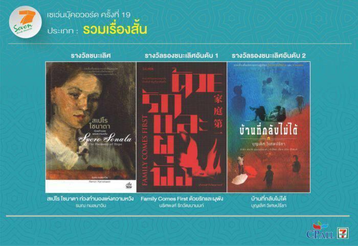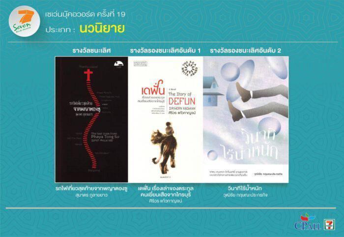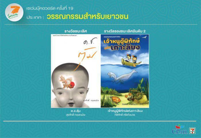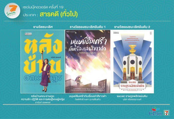 ซีพี ออลล์ ประกาศผลรางวัลเซเว่นบุ๊คอวอร์ด ครั้งที่ 19 ได้ผลงานชนะเลิศครบ 6 ประเภทหลัก “WHALE HUNTERS (นักล่าวาฬ)” ของ “จเด็จ กำจรเดช” คว้าชนะเลิศประเภทการ์ตูน “รถไฟเที่ยวสุดท้ายจากพญาตองซู” ของ “สุมาตร ภูลายยาว” ชนะเลิศนวนิยาย “จนกว่าโลกจะโอบกอดเราเอาไว้” ของ “ปาลิตา ผลประดับเพ็ชร์” ชนะเลิศกวีนิพนธ์ ขณะที่ “สเปโร โซนาตา ท่วงทำนองแห่งความหวัง” ของ “รมณ กมลนาวิน” ชนะเลิศรวมเรื่องสั้น “หลังบ้านคณะราษฎร : ความรัก ปฏิวัติ และการต่อสู้ของผู้หญิง” ของ “ชานันท์ ยอดหงษ์” ชนะเลิศสารคดี ด้าน “ด.ช. ตุ้ม” ของ “สุรศักดิ์ กฤษณมิษ” ชนะเลิศวรรณกรรมสำหรับเยาวชน