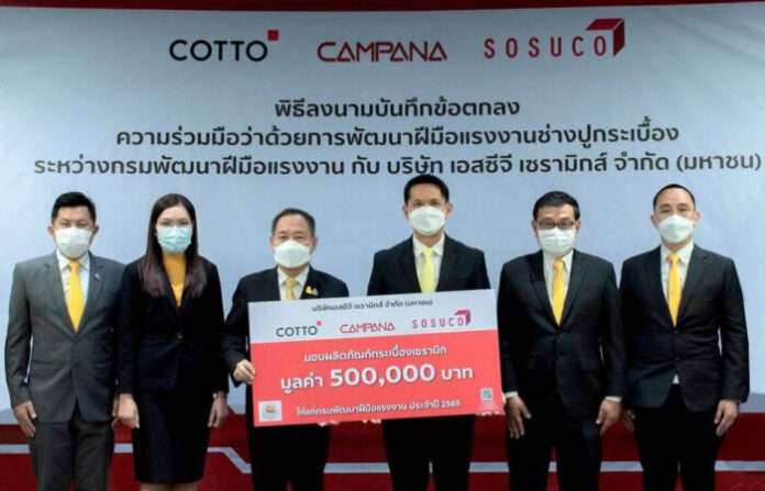 นายนำพล มลิชัย กรรมการผู้จัดการ บริษัทเอสซีจี เซรามิกส์ จำกัด (มหาชน) ผู้ผลิตและจำหน่ายกระเบื้องชั้นนำของไทยภายใต้แบรนด์ “คอตโต้” (COTTO) โสสุโก้ (SOSUCO) และ คัมพานา (CAMPANA) ร่วมกับกรมพัฒนาฝีมือแรงงาน (กพร.) กระทรวงแรงงาน โดยนายประทีป ทรงลำยอง อธิบดีกรมพัฒนาฝีมือแรงงาน ได้ร่วมกันลงนามบันทึกข้อตกลงนามความร่วมมือว่าด้วยการพัฒนาฝีมือแรงงานช่างปูกระเบื้อง พร้อมทั้งปลูกจิตสำนึกต่อสิ่งแวดล้อม (Green Job) ซึ่งความร่วมมือครั้งนี้เป็นการต่อยอดความสำเร็จที่ผ่านมา โดยมีเป้าหมายยกระดับกลไกการทำงานร่วมกันเพื่อสนับสนุนการพัฒนาศักยภาพของ ฝีมือแรงงานไทย สาขาปูกระเบื้องให้มีทักษะและความรู้ความชำนาญในการปูกระเบื้อง ได้อย่างถูกต้อง ได้มาตรฐาน สอดคล้องกับการเปลี่ยนแปลงของเทคโนโลยีและความต้องการของตลาดแรงงาน เพื่อรองรับต่อการขยายตัวของระบบเศรษฐกิจในอนาคตหลังโควิดเอฟเฟคโดยการจัดฝึกอบรมหลักสูตรช่างปูกระเบื้องให้แก่ช่างก่อสร้างในพื้นที่ 20 จังหวัด ณ ห้องประชุมปกรณ์ อังศุสิงห์ ชั้น 10 อาคารกรมพัฒนาฝีมือแรงงาน กระทรวงแรงงาน