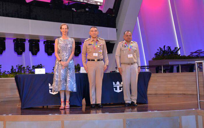 และรองผู้อำนวยการศูนย์อำนวยการรักษาผลประโยชน์ของชาติทางทะเล (Thai-MECC) และนายณรงค์ วุ่นซิ้ว ผู้ว่าราชการจังหวัดภูเก็ต ร่วมฉลองการกลับมาเทียบท่าเรือภูเก็ตอีกครั้งในรอบกว่า 2 ปี