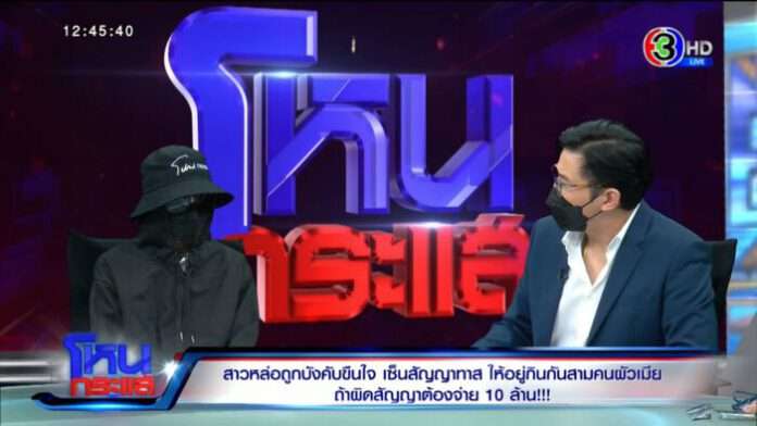 หนู : ใช่ค่ะ แล้วเรารู้สึกว่าเราอยู่อย่างนี้ไม่ได้ มันไม่จบสักที เราก็ตัดสินใจคุย นัดคุยที่โรงแรมแห่งหนึ่งค่ะ ทีนี้เขาก็ได้มีการเอาสัญญามาให้เราเซ็น ในนั้นก็ระบุว่าเราต้องยินยอมเป็นภรรยาอีกคนนึงของเขา