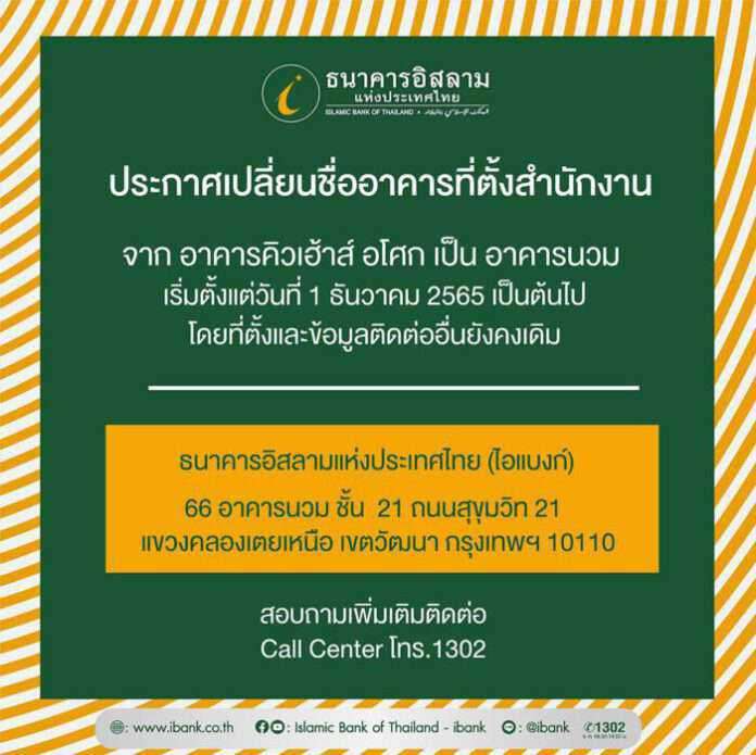 ธนาคารอิสลามแห่งประเทศไทย (ไอแบงก์) แจ้งเปลี่ยนชื่ออาคารที่ตั้งสำนักงานใหญ่ จาก อาคารคิวเฮ้าส์ อโศก เป็น อาคารนวม เริ่มตั้งแต่วันที่ 1 ธันวาคม 2565 เป็นต้นไป โดยที่ตั้งและข้อมูลติดต่ออื่นยังคงเดิม